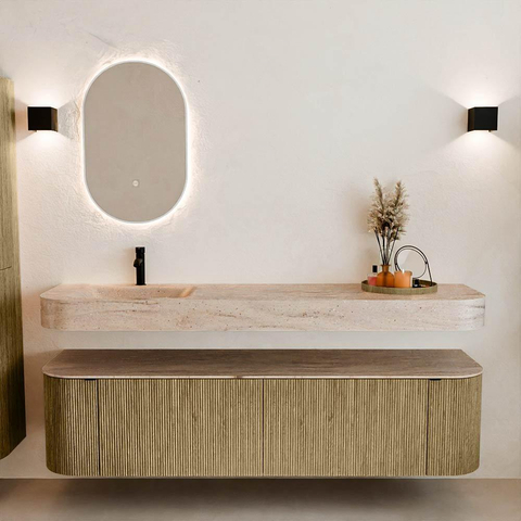 Natuurlijke materialen in warme tinten. De verticale ribbels brengen ritme en textuur in het ontwerp, terwijl het eikenhout zorgt voor een warme, ambachtelijke uitstraling. Kies uit 5 houttinten OAK, WALNUT, DUSK, SHADOW en RUBY zorgvuldig geselecteerde houtkleuren om zowel moderne als klassieke badkamers te verrijken.