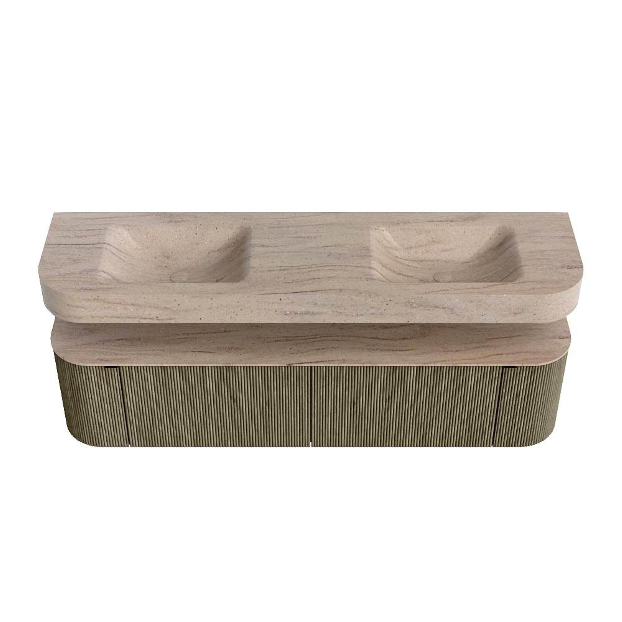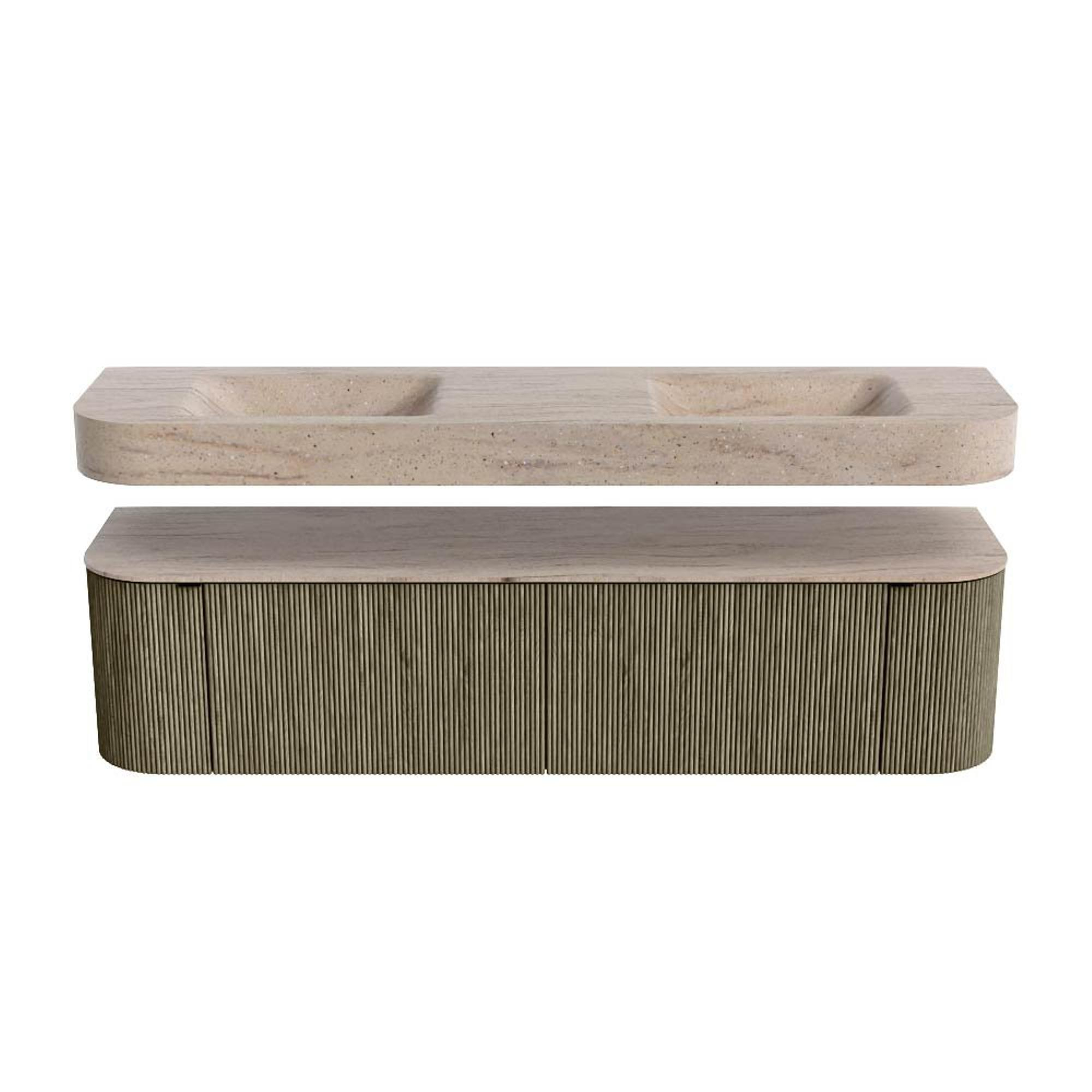 MONDIAZ THOR-DLUX 180cm badmeubel ronding links + rechts kleur Shadow met 2 lades en 2 deuren. Vrijhangende wastafel CLOUD Dubbel zonder kraangat kleur Saba.