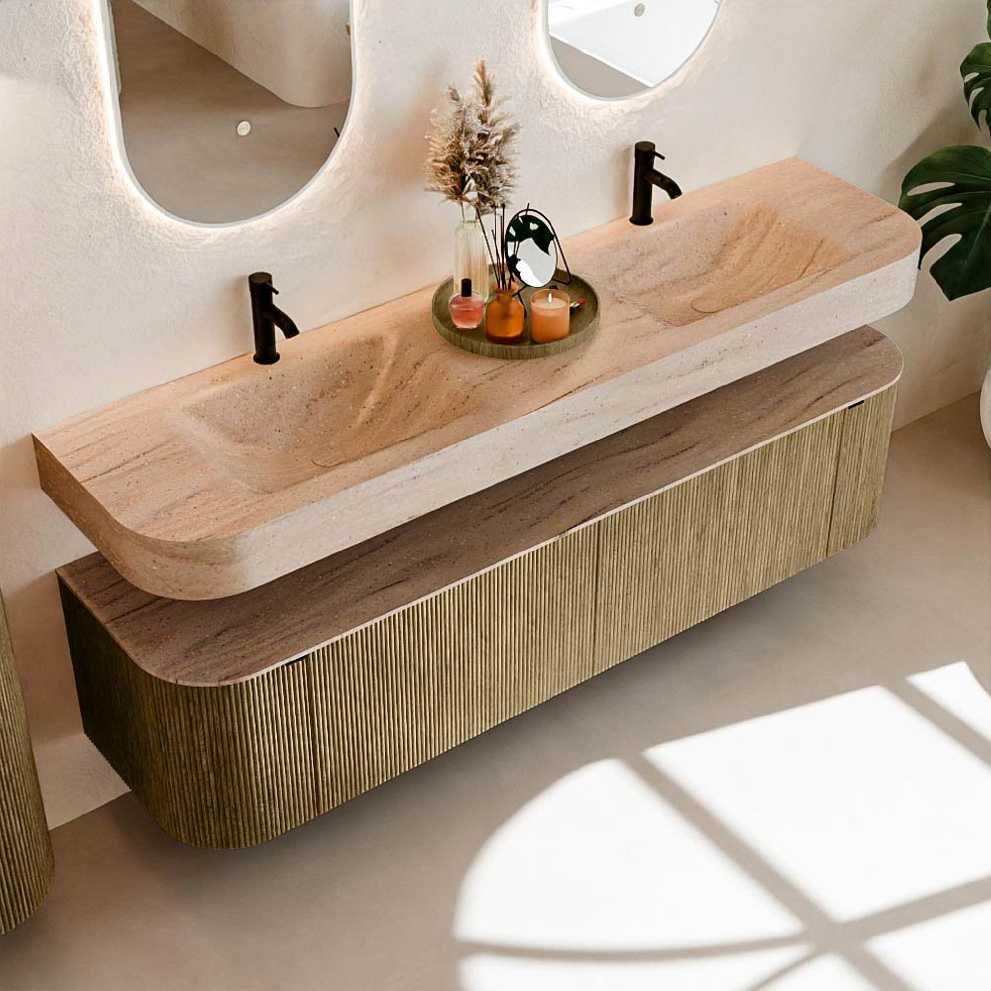 Natuurlijke materialen in warme tinten. De verticale ribbels brengen ritme en textuur in het ontwerp, terwijl het eikenhout zorgt voor een warme, ambachtelijke uitstraling. Kies uit 5 houttinten OAK, WALNUT, DUSK, SHADOW en RUBY zorgvuldig geselecteerde houtkleuren om zowel moderne als klassieke badkamers te verrijken.