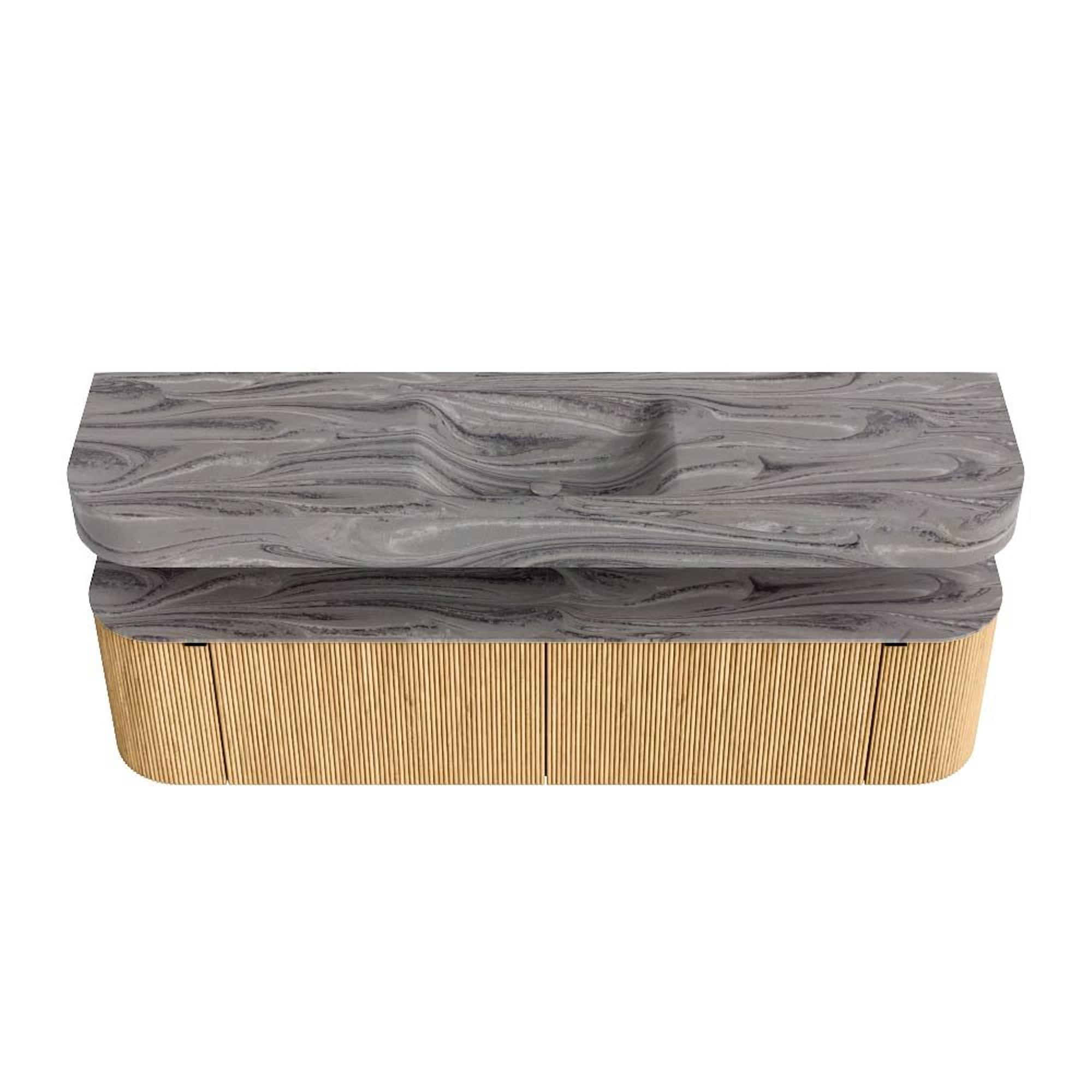 Boven het meubel zweeft een bijpassende, vrij hangende wastafel met afgeronde hoeken – perfect afgestemd op de vorm van de kast. De wastafel is uitgevoerd in Solid Surface en volgt subtiel de lijnen van het onderliggende meubel, waardoor een harmonieus geheel ontstaat. Het Solid Surface topblad vormt een sterke, onderhoudsvriendelijke basis en maakt de combinatie compleet.