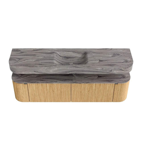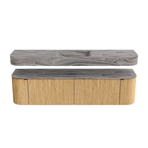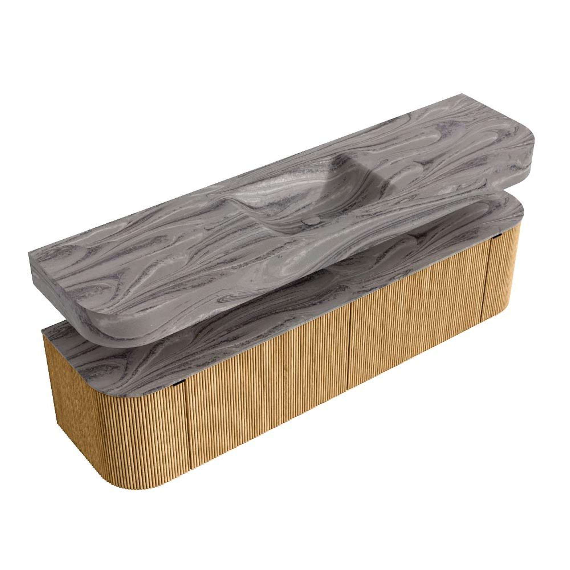 MONDIAZ THOR-DLUX 180cm badmeubel ronding links + rechts kleur Oak met 2 lades en 2 deuren. Vrijhangende wastafel CLOUD Midden 1 kraangat kleur Sombra.