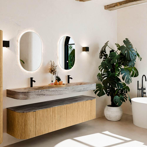 Natuurlijke materialen in warme tinten. De verticale ribbels brengen ritme en textuur in het ontwerp, terwijl het eikenhout zorgt voor een warme, ambachtelijke uitstraling. Kies uit 5 houttinten OAK, WALNUT, DUSK, SHADOW en RUBY zorgvuldig geselecteerde houtkleuren om zowel moderne als klassieke badkamers te verrijken.