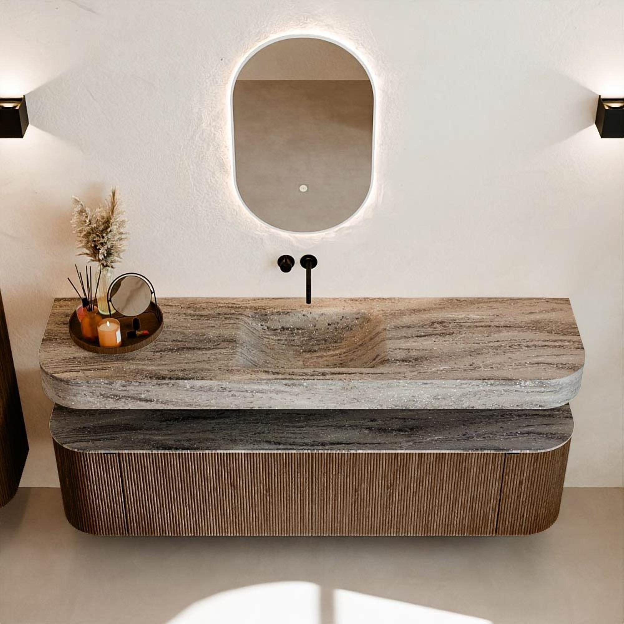 Natuurlijke materialen in warme tinten. De verticale ribbels brengen ritme en textuur in het ontwerp, terwijl het eikenhout zorgt voor een warme, ambachtelijke uitstraling. Kies uit 5 houttinten OAK, WALNUT, DUSK, SHADOW en RUBY zorgvuldig geselecteerde houtkleuren om zowel moderne als klassieke badkamers te verrijken.