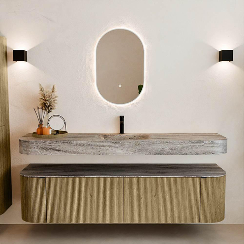 Natuurlijke materialen in warme tinten. De verticale ribbels brengen ritme en textuur in het ontwerp, terwijl het eikenhout zorgt voor een warme, ambachtelijke uitstraling. Kies uit 5 houttinten OAK, WALNUT, DUSK, SHADOW en RUBY zorgvuldig geselecteerde houtkleuren om zowel moderne als klassieke badkamers te verrijken.
