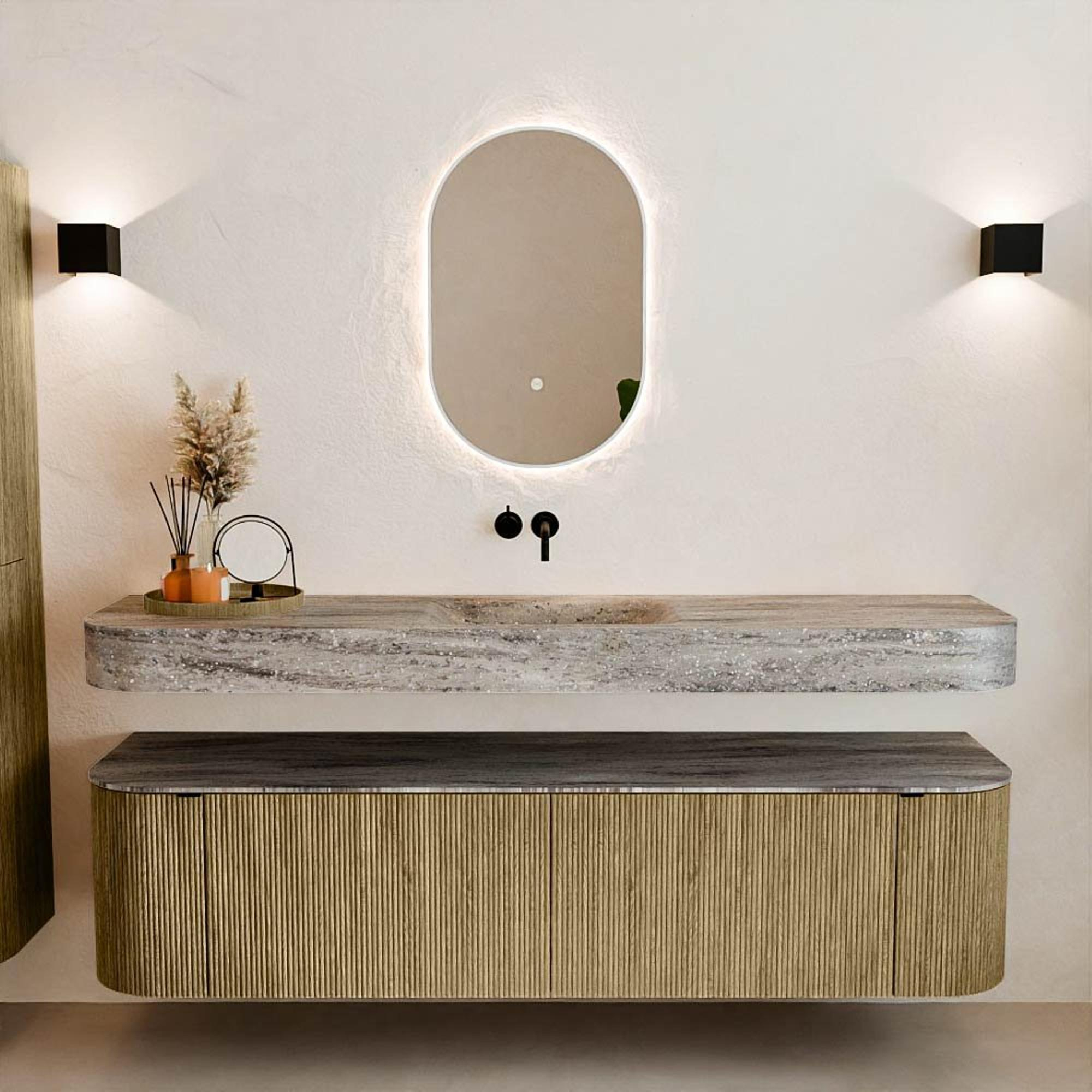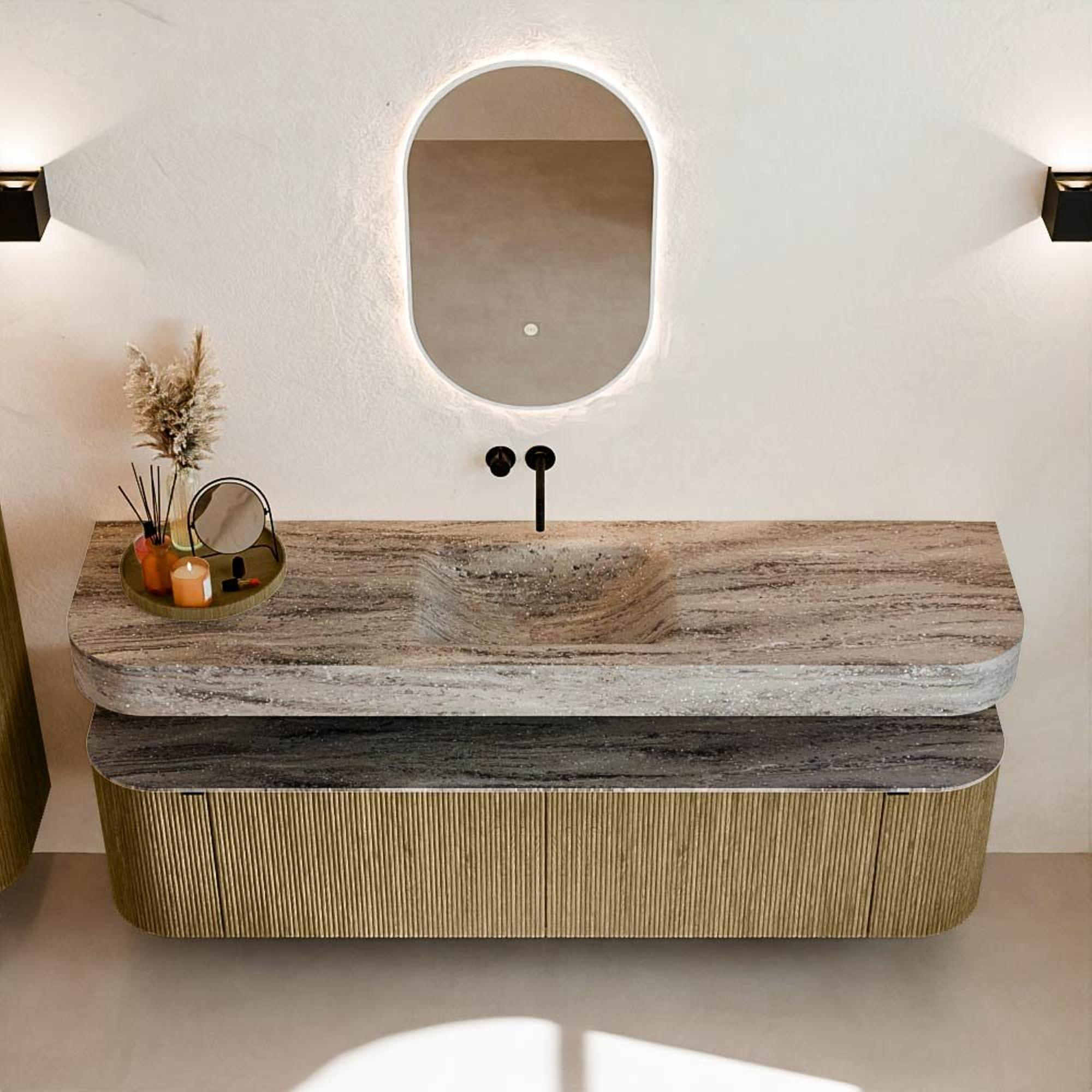 Natuurlijke materialen in warme tinten. De verticale ribbels brengen ritme en textuur in het ontwerp, terwijl het eikenhout zorgt voor een warme, ambachtelijke uitstraling. Kies uit 5 houttinten OAK, WALNUT, DUSK, SHADOW en RUBY zorgvuldig geselecteerde houtkleuren om zowel moderne als klassieke badkamers te verrijken.