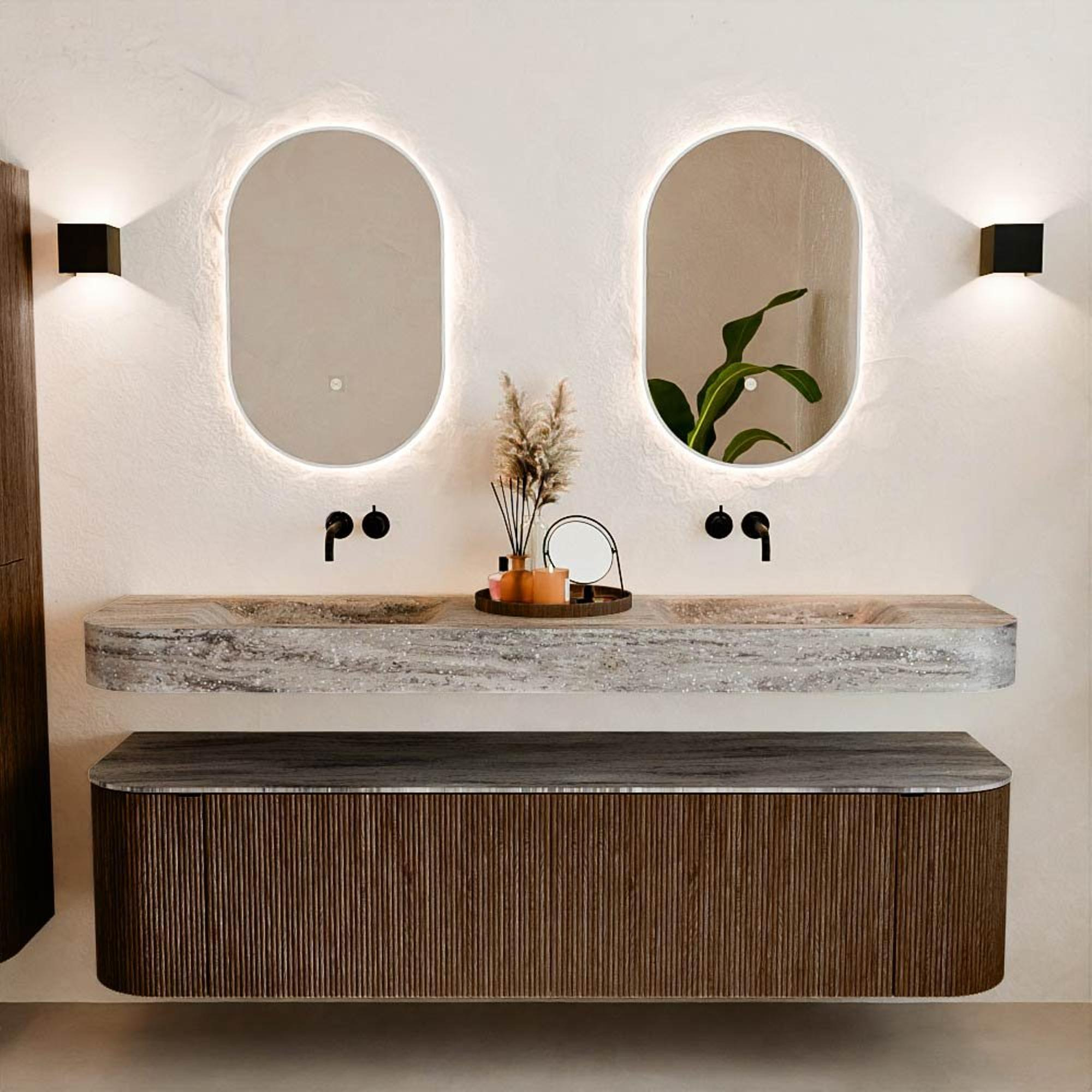 Natuurlijke materialen in warme tinten. De verticale ribbels brengen ritme en textuur in het ontwerp, terwijl het eikenhout zorgt voor een warme, ambachtelijke uitstraling. Kies uit 5 houttinten OAK, WALNUT, DUSK, SHADOW en RUBY zorgvuldig geselecteerde houtkleuren om zowel moderne als klassieke badkamers te verrijken.