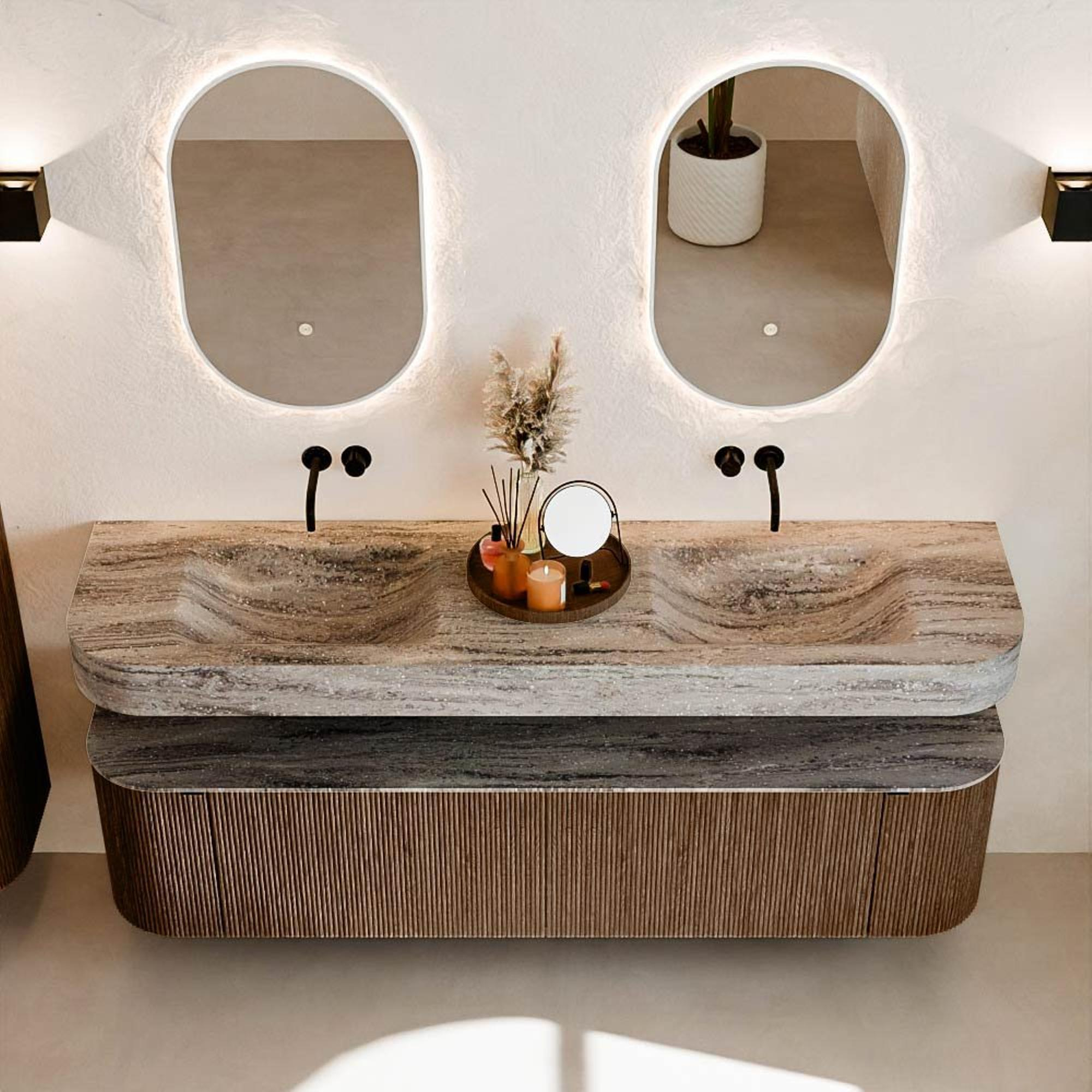 MONDIAZ THOR-DLUX 180cm badmeubel ronding links + rechts kleur Walnut met 2 lades en 2 deuren. Vrijhangende wastafel CLOUD Dubbel zonder kraangat kleur Oza.