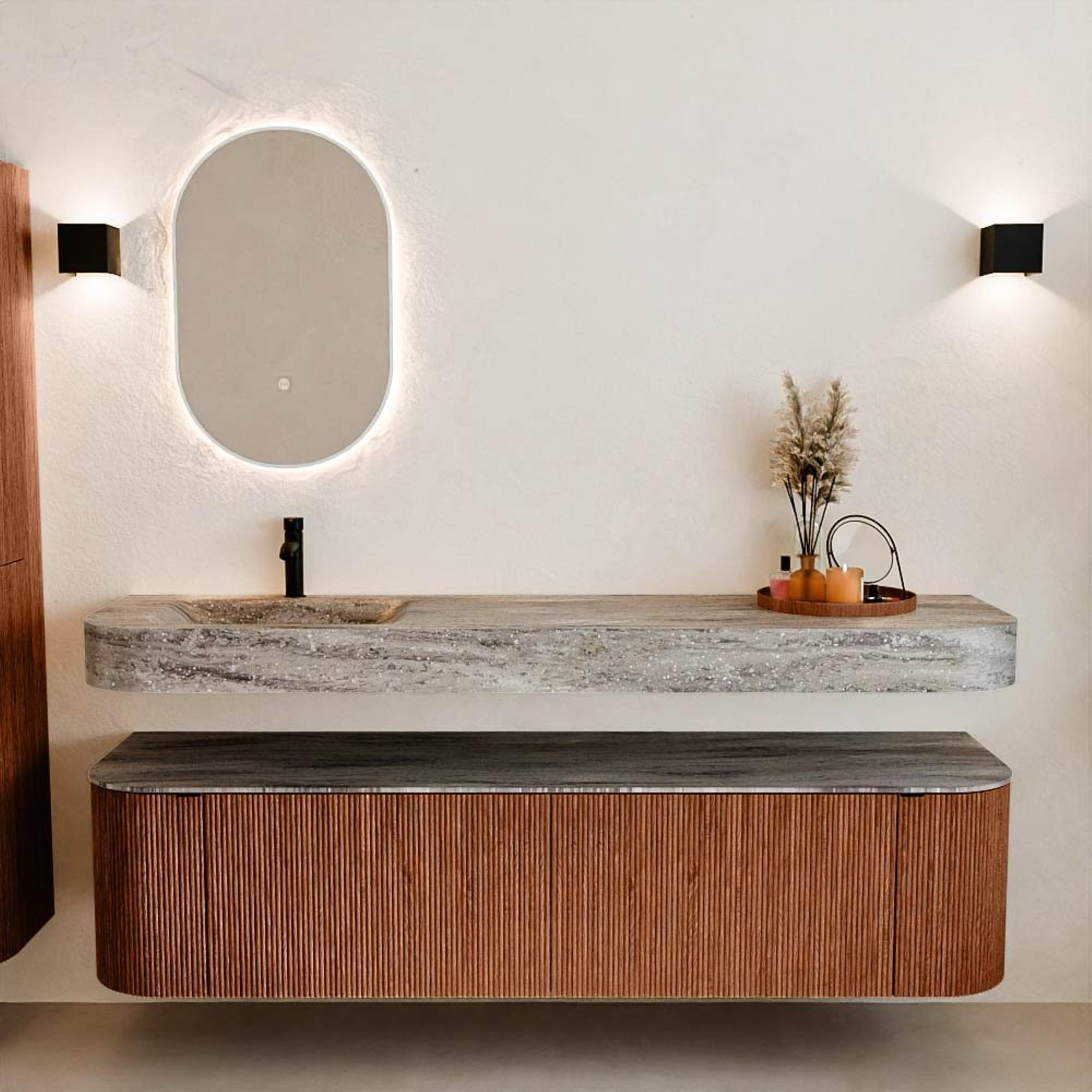Natuurlijke materialen in warme tinten. De verticale ribbels brengen ritme en textuur in het ontwerp, terwijl het eikenhout zorgt voor een warme, ambachtelijke uitstraling. Kies uit 5 houttinten OAK, WALNUT, DUSK, SHADOW en RUBY zorgvuldig geselecteerde houtkleuren om zowel moderne als klassieke badkamers te verrijken.