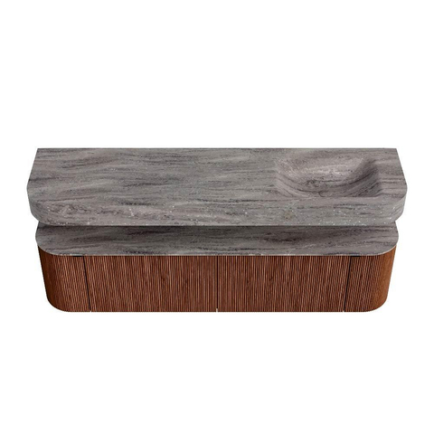 Boven het meubel zweeft een bijpassende, vrij hangende wastafel met afgeronde hoeken – perfect afgestemd op de vorm van de kast. De wastafel is uitgevoerd in Solid Surface en volgt subtiel de lijnen van het onderliggende meubel, waardoor een harmonieus geheel ontstaat. Het Solid Surface topblad vormt een sterke, onderhoudsvriendelijke basis en maakt de combinatie compleet.