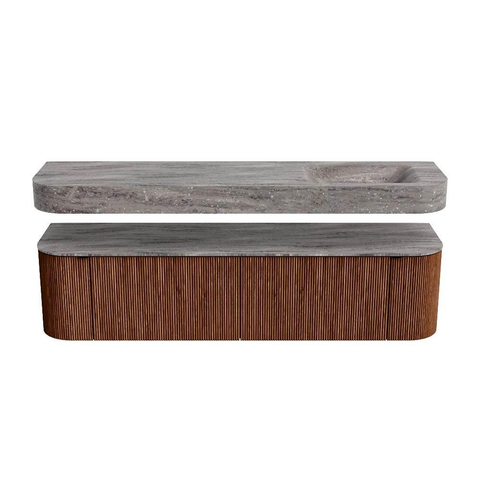 MONDIAZ THOR-DLUX 180cm badmeubel ronding links + rechts kleur Ruby met 2 lades en 2 deuren. Vrijhangende wastafel CLOUD Rechts zonder kraangat kleur Oza.