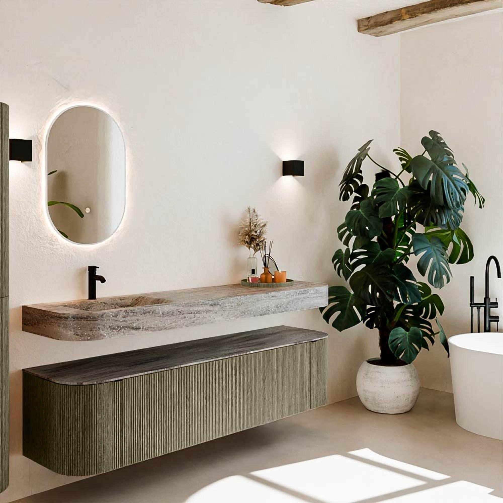 Natuurlijke materialen in warme tinten. De verticale ribbels brengen ritme en textuur in het ontwerp, terwijl het eikenhout zorgt voor een warme, ambachtelijke uitstraling. Kies uit 5 houttinten OAK, WALNUT, DUSK, SHADOW en RUBY zorgvuldig geselecteerde houtkleuren om zowel moderne als klassieke badkamers te verrijken.
