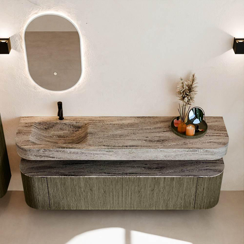 MONDIAZ THOR-DLUX 180cm badmeubel ronding links + rechts kleur Shadow met 2 lades en 2 deuren. Vrijhangende wastafel CLOUD Links 1 kraangat kleur Oza.