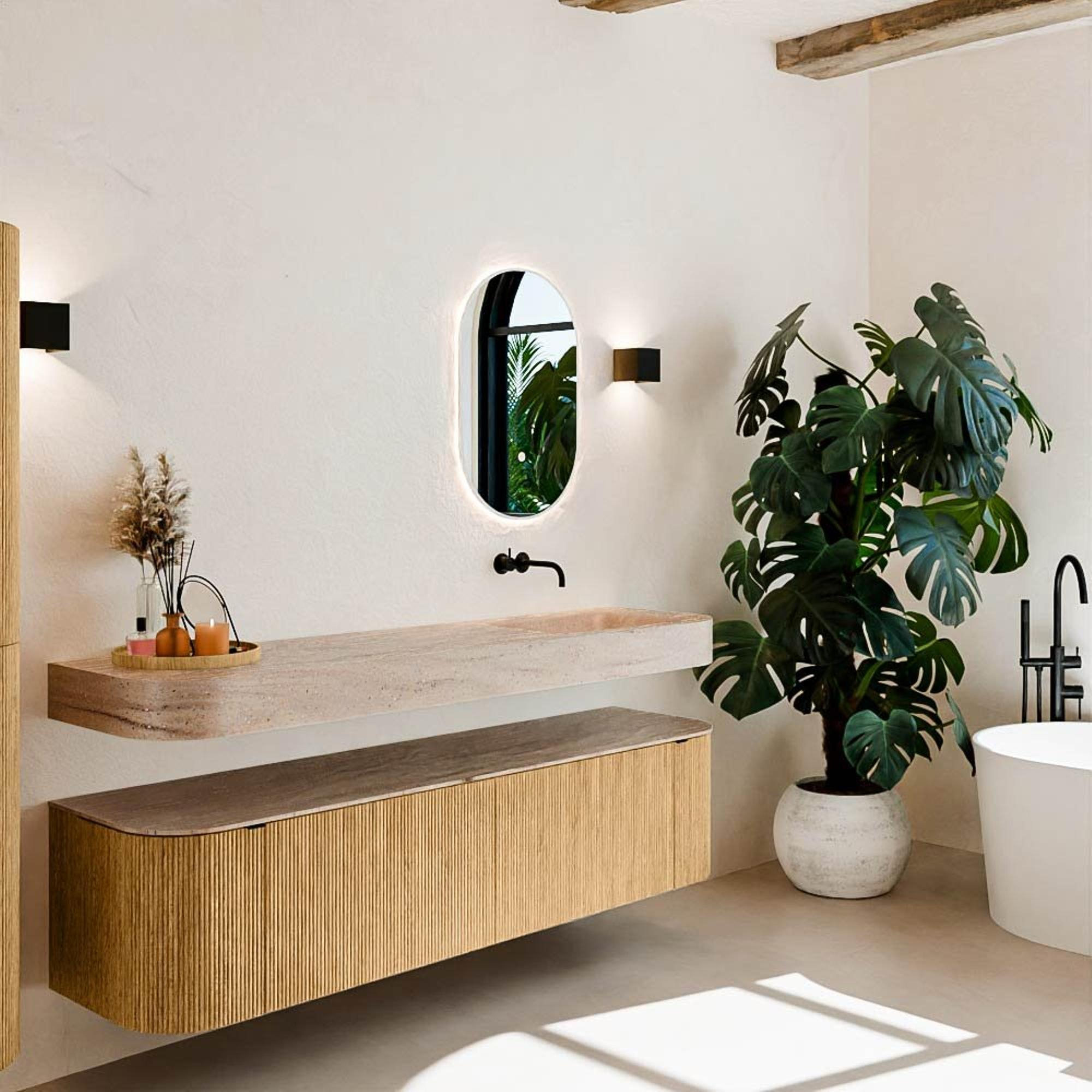 Natuurlijke materialen in warme tinten. De verticale ribbels brengen ritme en textuur in het ontwerp, terwijl het eikenhout zorgt voor een warme, ambachtelijke uitstraling. Kies uit 5 houttinten OAK, WALNUT, DUSK, SHADOW en RUBY zorgvuldig geselecteerde houtkleuren om zowel moderne als klassieke badkamers te verrijken.