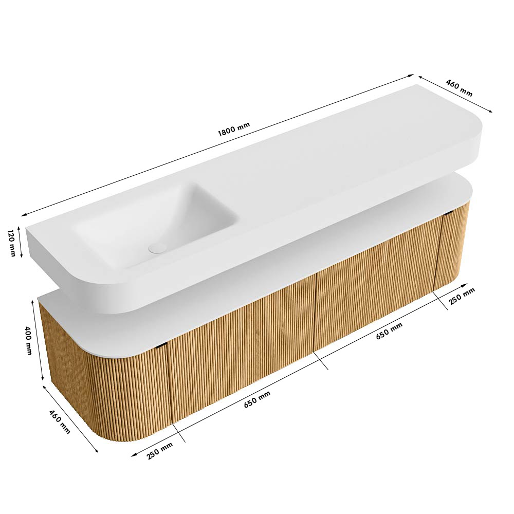 Boven het meubel zweeft een bijpassende, vrij hangende wastafel met afgeronde hoeken – perfect afgestemd op de vorm van de kast. De wastafel is uitgevoerd in Solid Surface en volgt subtiel de lijnen van het onderliggende meubel, waardoor een harmonieus geheel ontstaat. Het Solid Surface topblad vormt een sterke, onderhoudsvriendelijke basis en maakt de combinatie compleet.