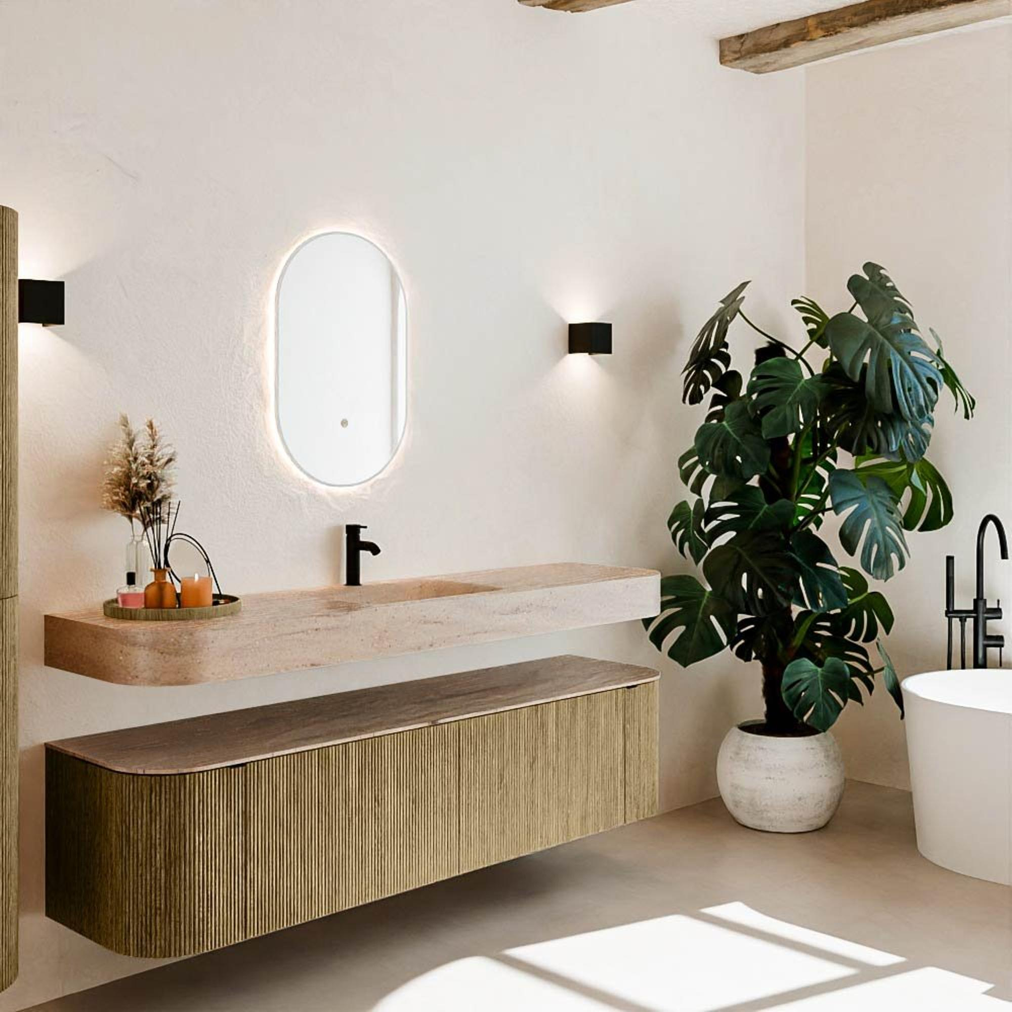 Natuurlijke materialen in warme tinten. De verticale ribbels brengen ritme en textuur in het ontwerp, terwijl het eikenhout zorgt voor een warme, ambachtelijke uitstraling. Kies uit 5 houttinten OAK, WALNUT, DUSK, SHADOW en RUBY zorgvuldig geselecteerde houtkleuren om zowel moderne als klassieke badkamers te verrijken.