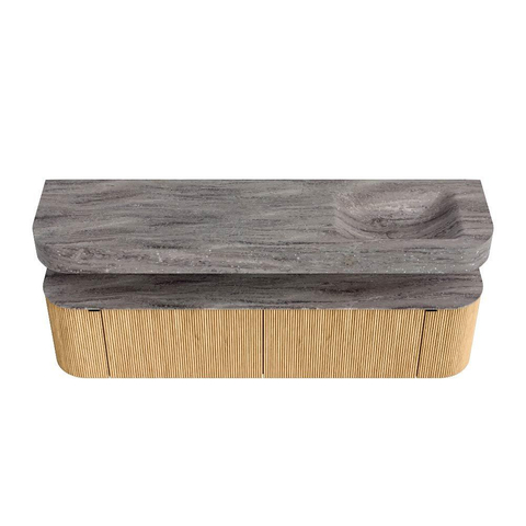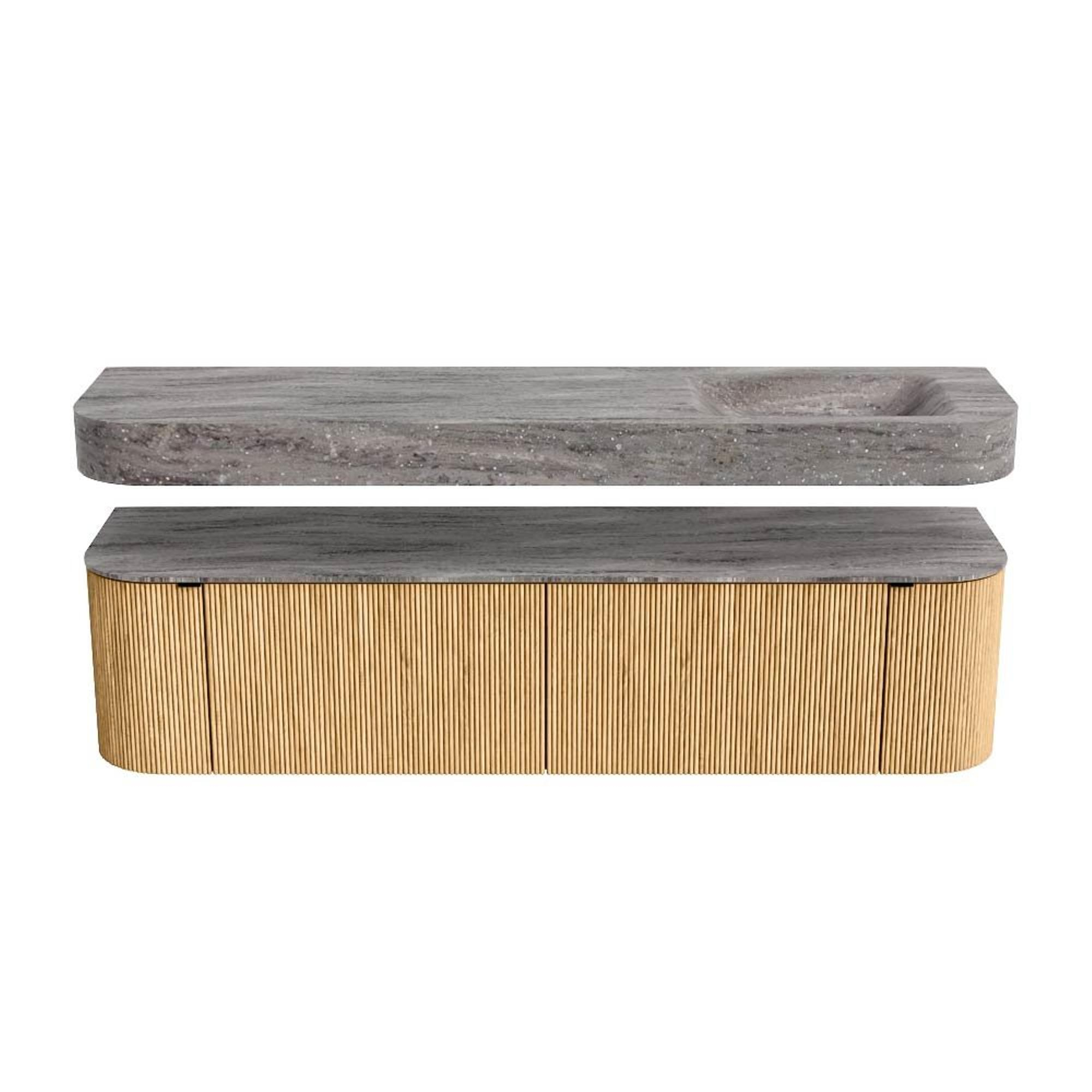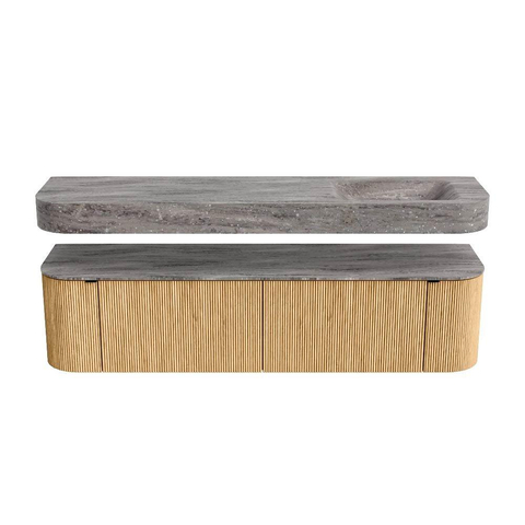 MONDIAZ THOR-DLUX 180cm badmeubel ronding links + rechts kleur Oak met 2 lades en 2 deuren. Vrijhangende wastafel CLOUD Rechts 1 kraangat kleur Oza.