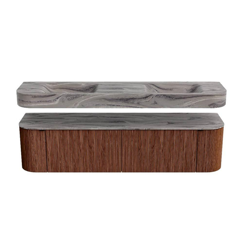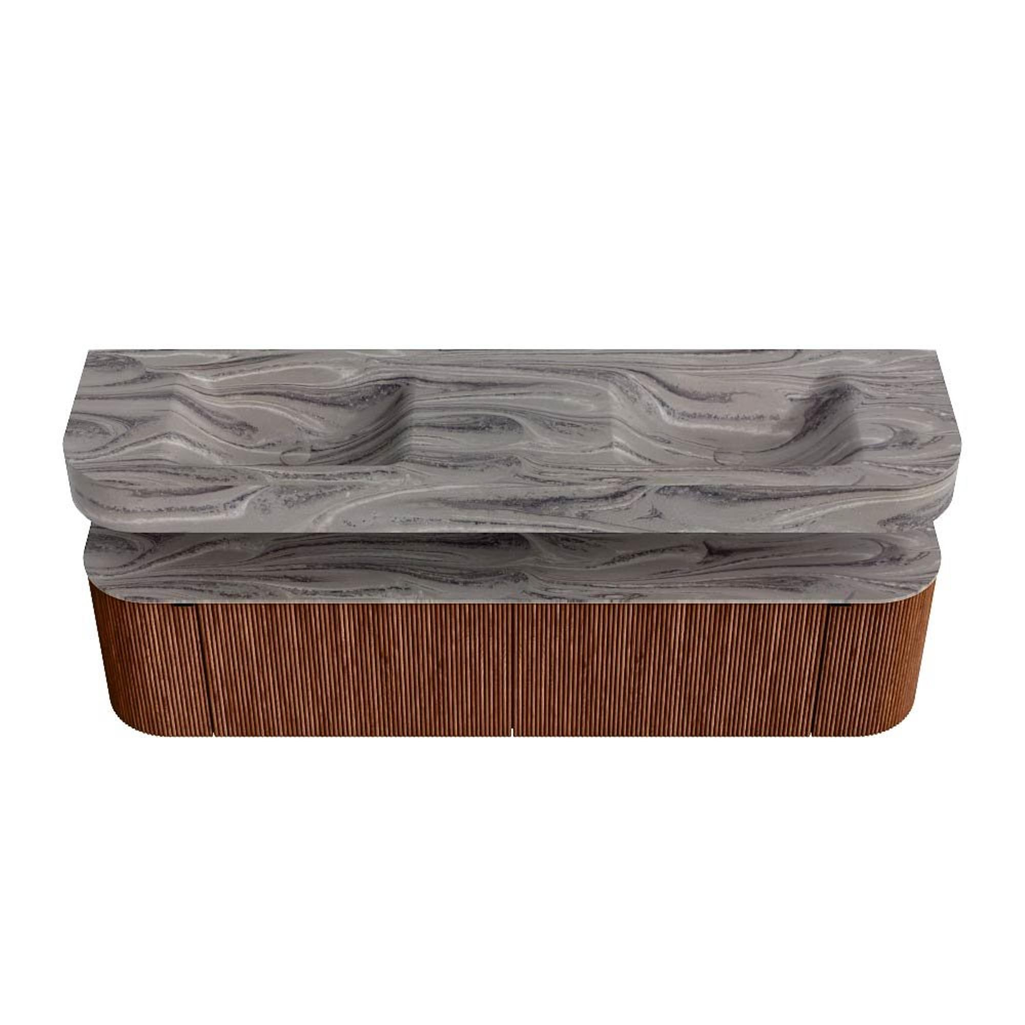 MONDIAZ THOR-DLUX 180cm badmeubel ronding links + rechts kleur Ruby met 2 lades en 2 deuren. Vrijhangende wastafel CLOUD Dubbel zonder kraangat kleur Sombra.