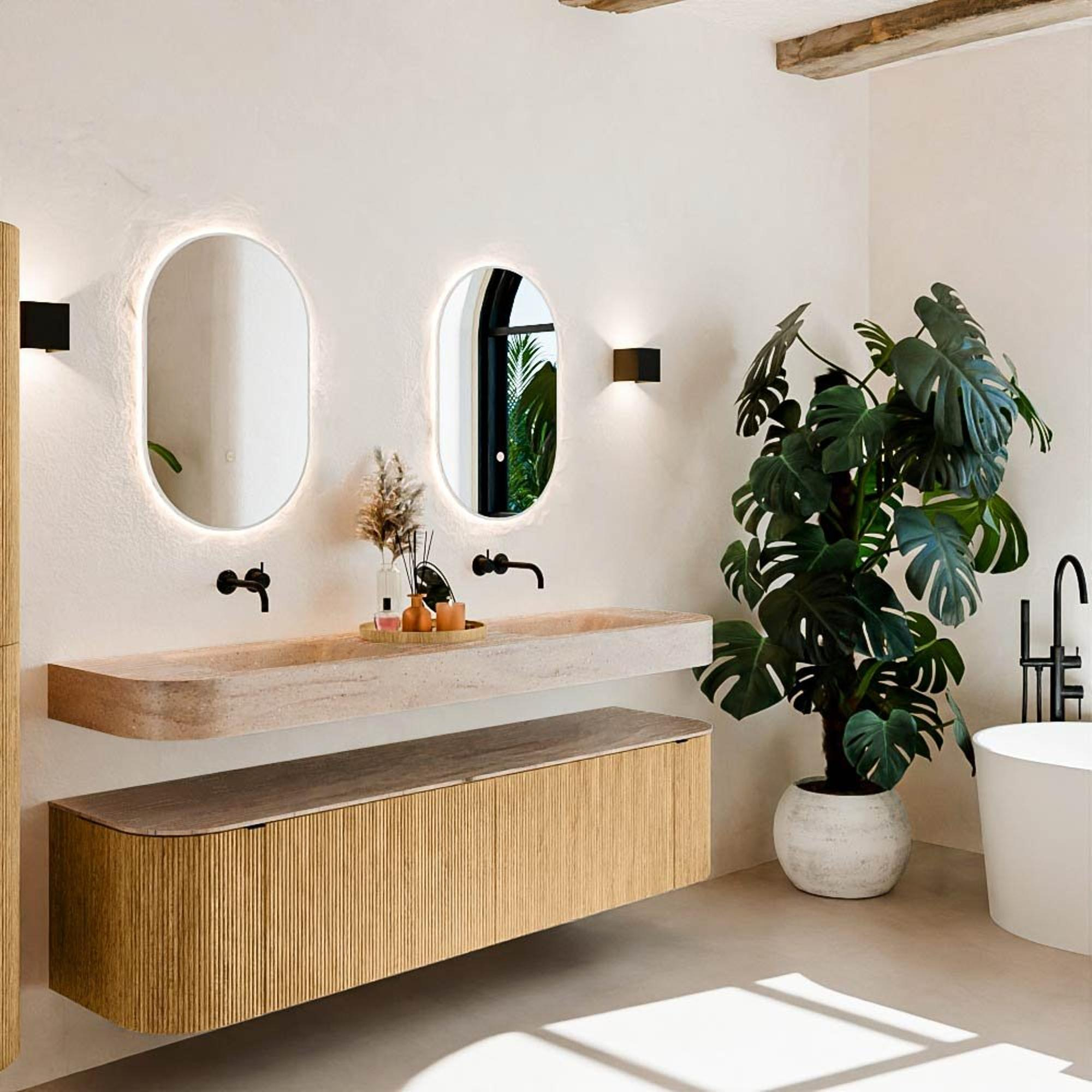 Natuurlijke materialen in warme tinten. De verticale ribbels brengen ritme en textuur in het ontwerp, terwijl het eikenhout zorgt voor een warme, ambachtelijke uitstraling. Kies uit 5 houttinten OAK, WALNUT, DUSK, SHADOW en RUBY zorgvuldig geselecteerde houtkleuren om zowel moderne als klassieke badkamers te verrijken.