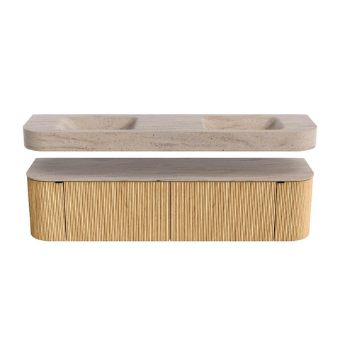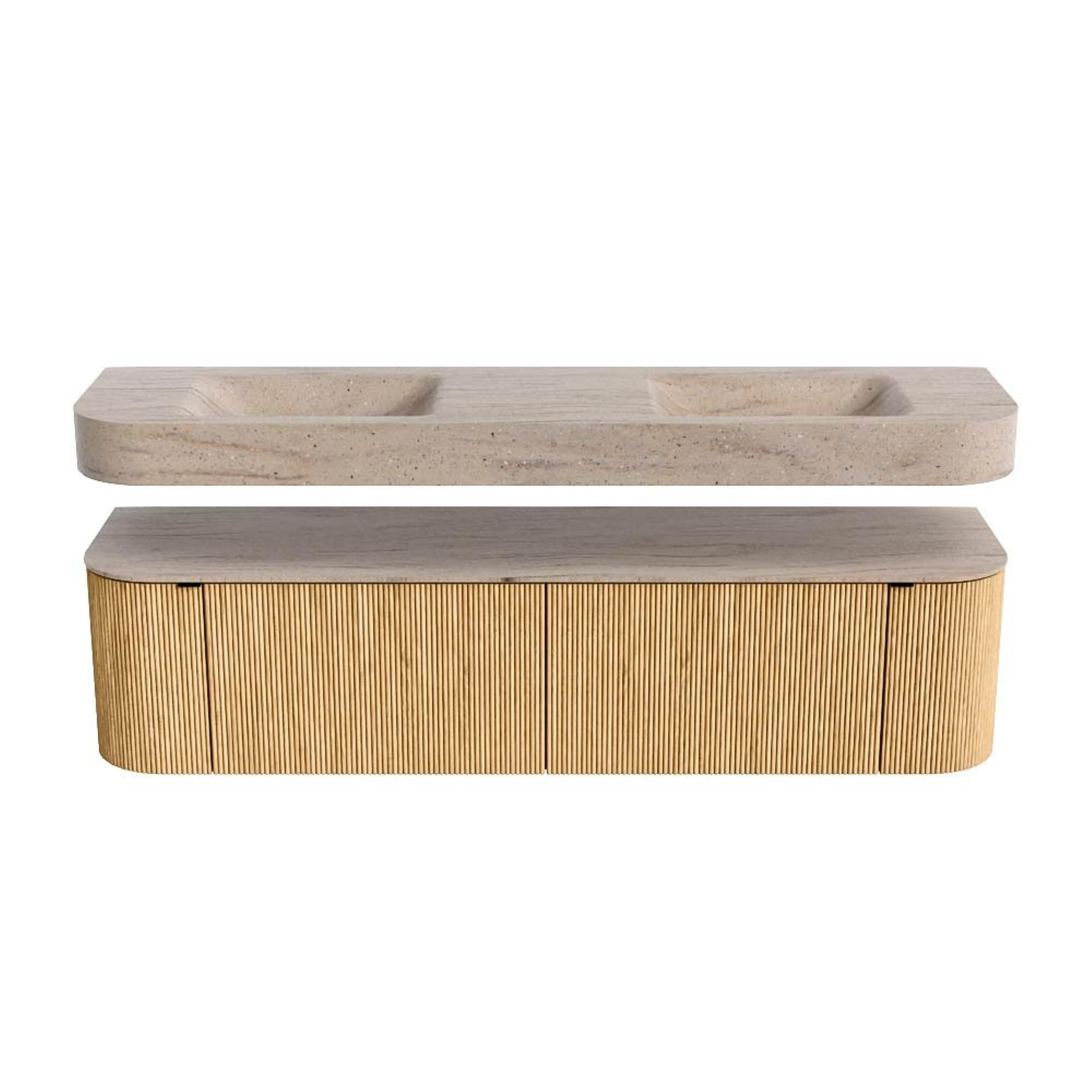 MONDIAZ THOR-DLUX 180cm badmeubel ronding links + rechts kleur Oak met 2 lades en 2 deuren. Vrijhangende wastafel CLOUD Dubbel zonder kraangat kleur Saba.