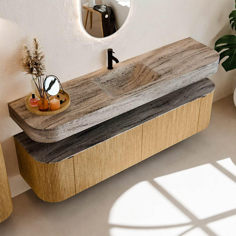 Natuurlijke materialen in warme tinten. De verticale ribbels brengen ritme en textuur in het ontwerp, terwijl het eikenhout zorgt voor een warme, ambachtelijke uitstraling. Kies uit 5 houttinten OAK, WALNUT, DUSK, SHADOW en RUBY zorgvuldig geselecteerde houtkleuren om zowel moderne als klassieke badkamers te verrijken.