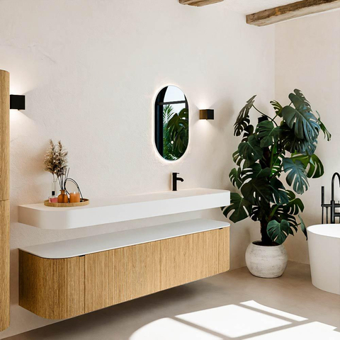 Natuurlijke materialen in warme tinten. De verticale ribbels brengen ritme en textuur in het ontwerp, terwijl het eikenhout zorgt voor een warme, ambachtelijke uitstraling. Kies uit 5 houttinten OAK, WALNUT, DUSK, SHADOW en RUBY zorgvuldig geselecteerde houtkleuren om zowel moderne als klassieke badkamers te verrijken.