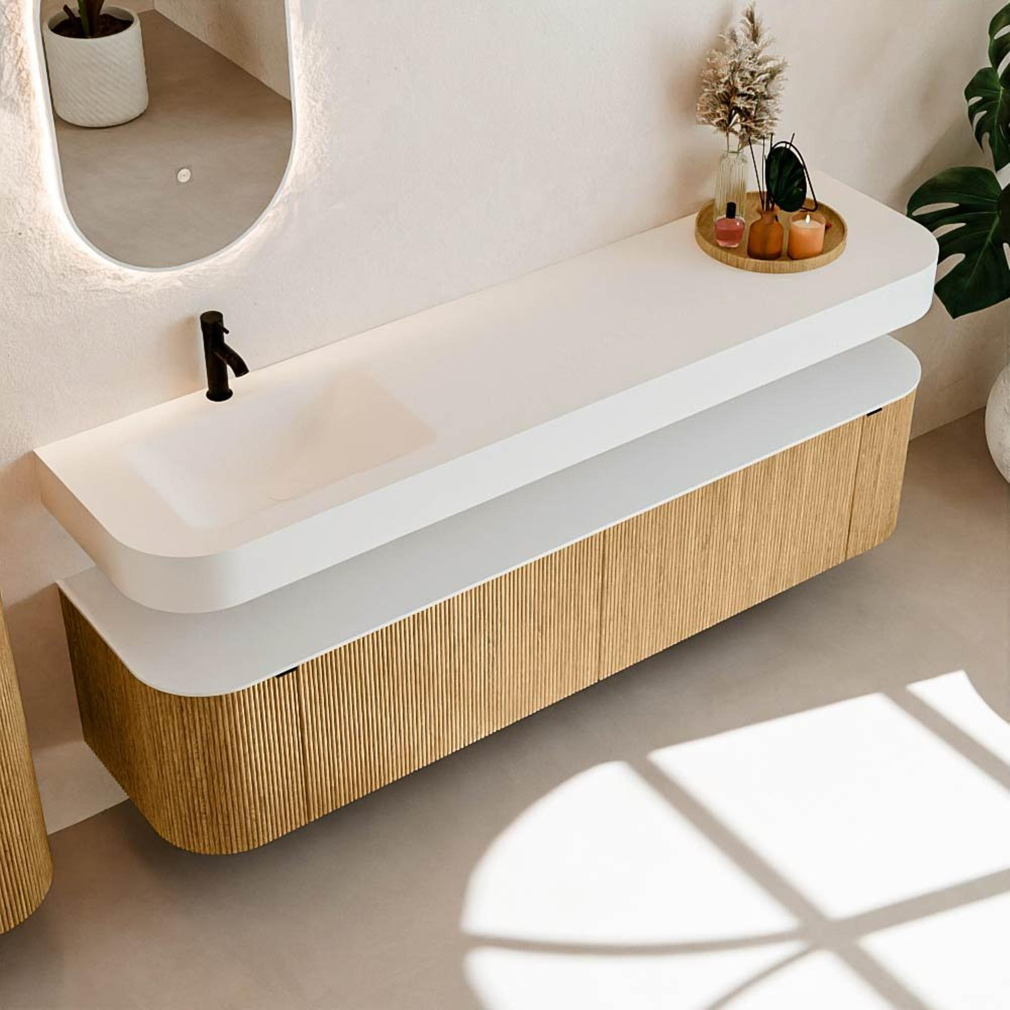 Boven het meubel zweeft een bijpassende, vrij hangende wastafel met afgeronde hoeken – perfect afgestemd op de vorm van de kast. De wastafel is uitgevoerd in Solid Surface en volgt subtiel de lijnen van het onderliggende meubel, waardoor een harmonieus geheel ontstaat. Het Solid Surface topblad vormt een sterke, onderhoudsvriendelijke basis en maakt de combinatie compleet.