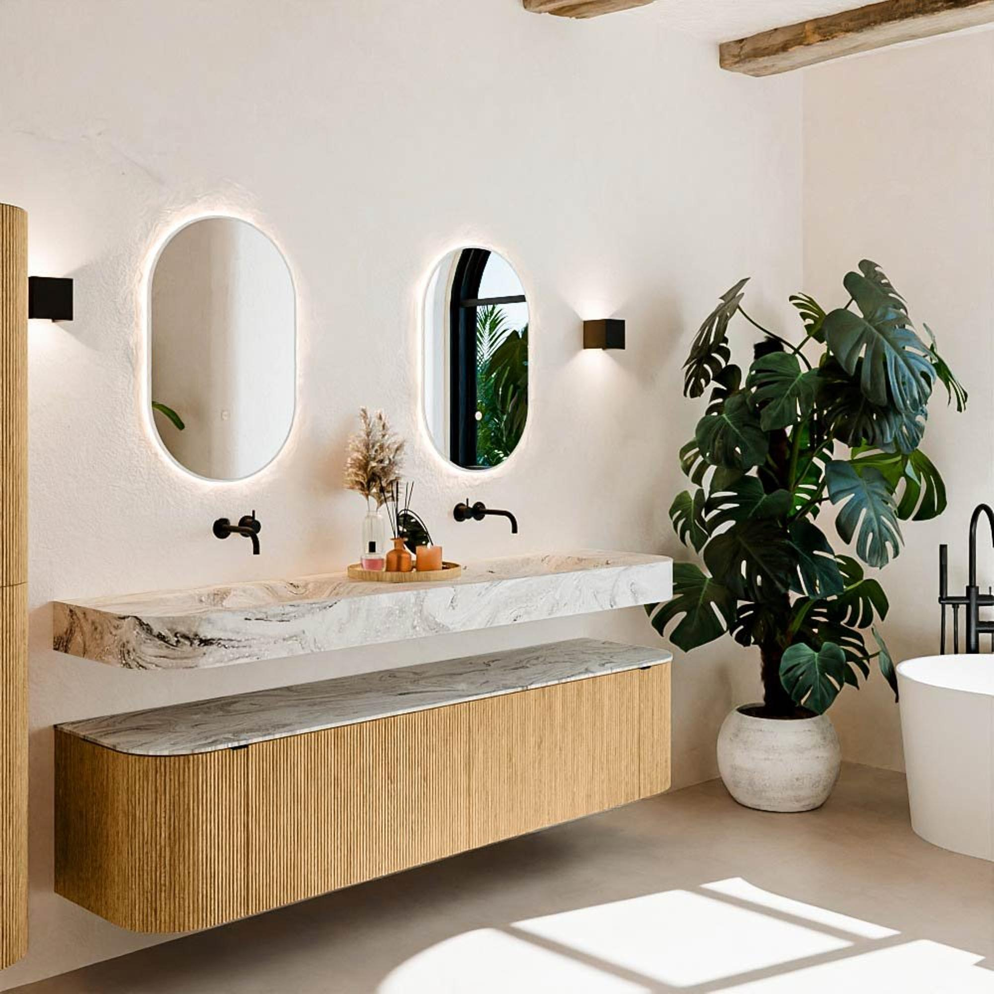 MONDIAZ THOR-DLUX 190cm badmeubel ronding links + rechts kleur Oak met 2 lades en 2 deuren. Vrijhangende wastafel CLOUD Dubbel zonder kraangat kleur Glace.
