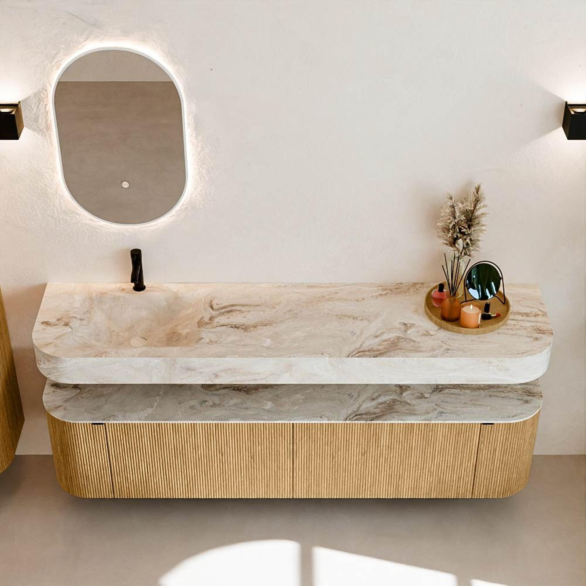 MONDIAZ THOR-DLUX 190cm badmeubel ronding links + rechts kleur Oak met 2 lades en 2 deuren. Vrijhangende wastafel CLOUD Links 1 kraangat kleur Frappe.