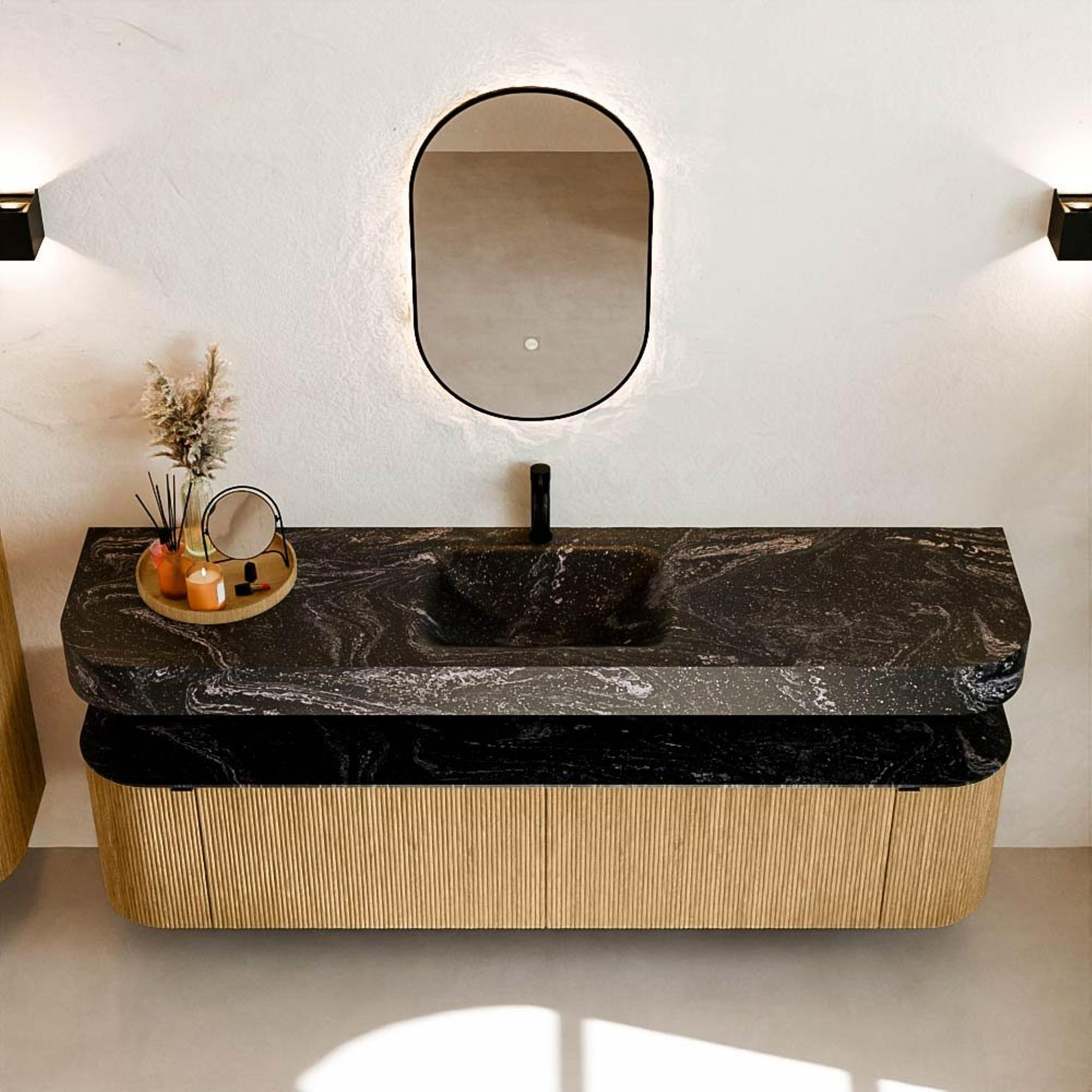 MONDIAZ THOR-DLUX 190cm badmeubel ronding links + rechts kleur Oak met 2 lades en 2 deuren. Vrijhangende wastafel CLOUD Midden 1 kraangat kleur Lava.