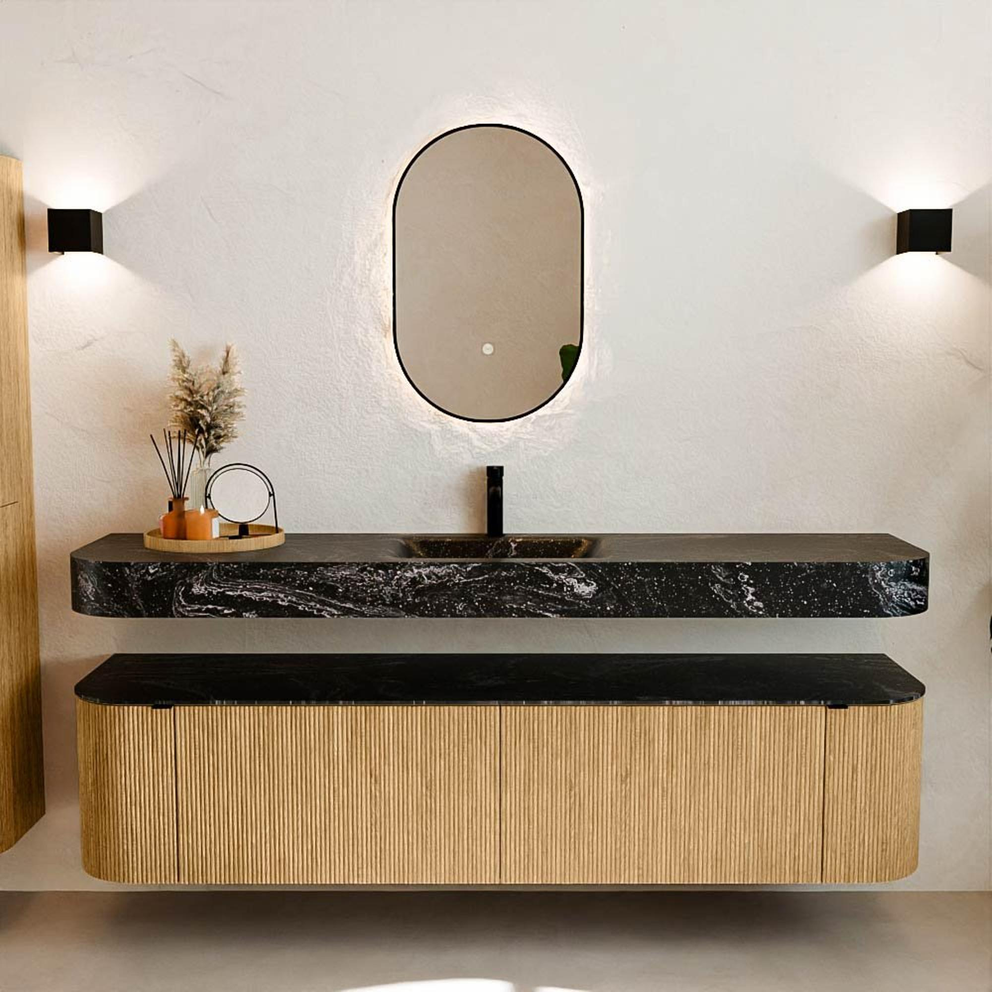 Natuurlijke materialen in warme tinten. De verticale ribbels brengen ritme en textuur in het ontwerp, terwijl het eikenhout zorgt voor een warme, ambachtelijke uitstraling. Kies uit 5 houttinten OAK, WALNUT, DUSK, SHADOW en RUBY zorgvuldig geselecteerde houtkleuren om zowel moderne als klassieke badkamers te verrijken.