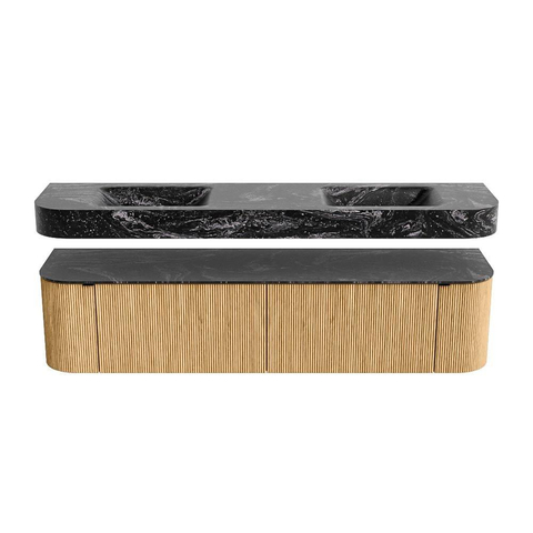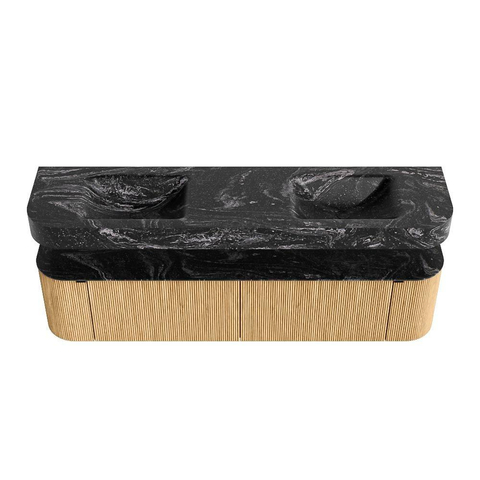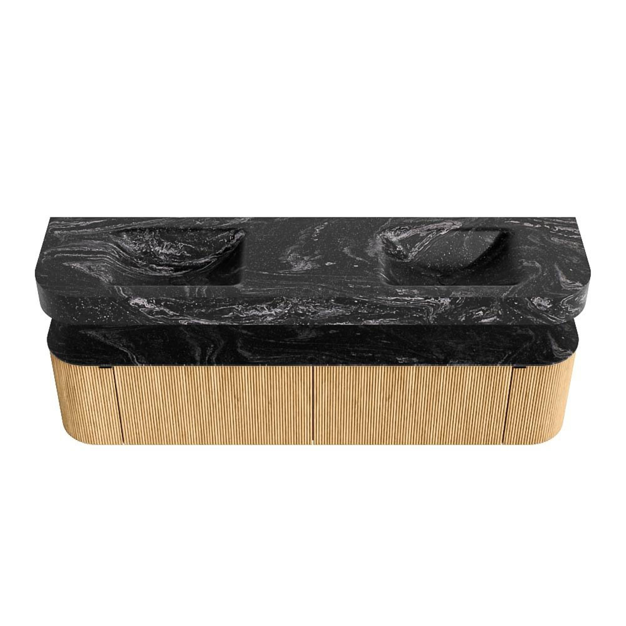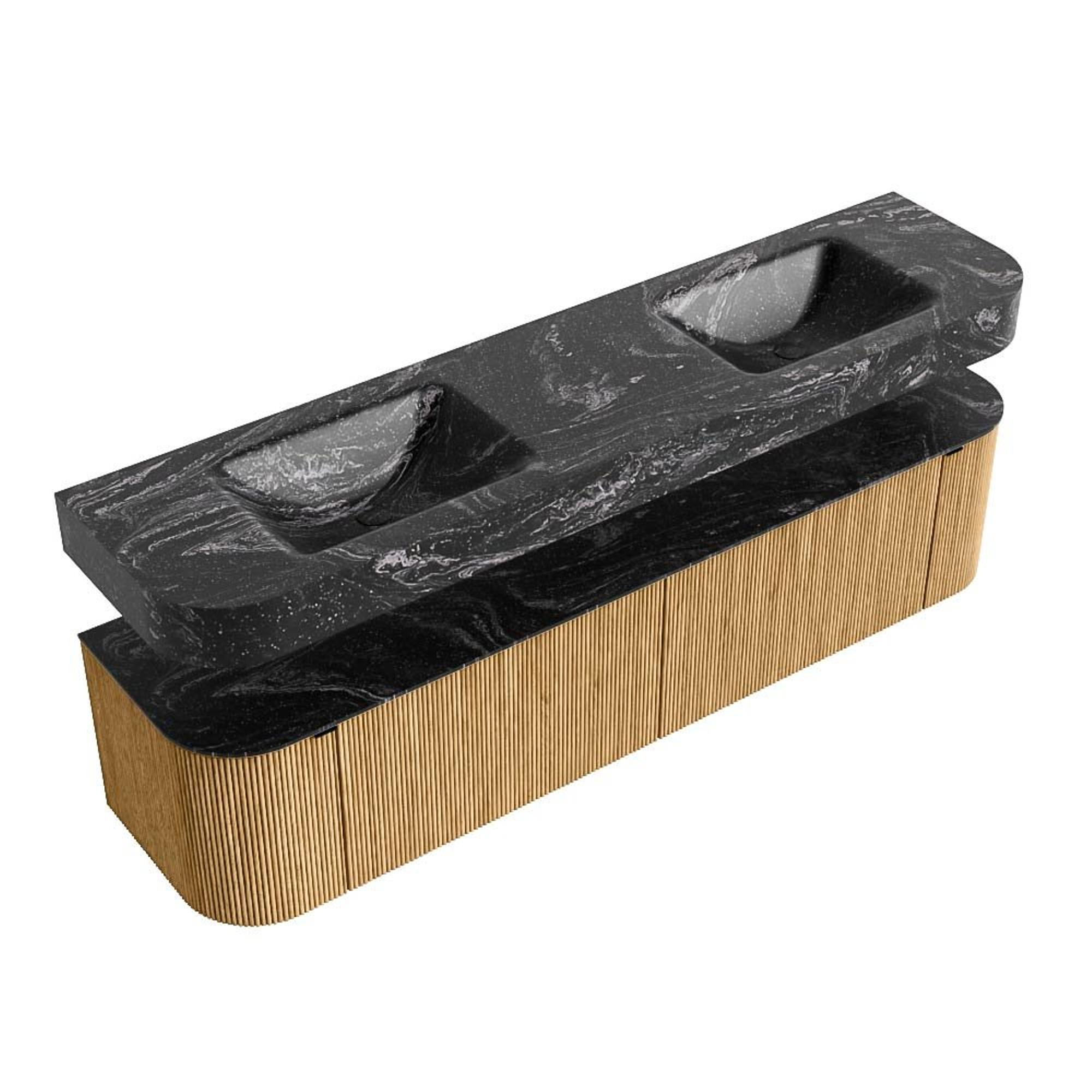 MONDIAZ THOR-DLUX 190cm badmeubel ronding links + rechts kleur Oak met 2 lades en 2 deuren. Vrijhangende wastafel CLOUD Dubbel zonder kraangat kleur Lava.