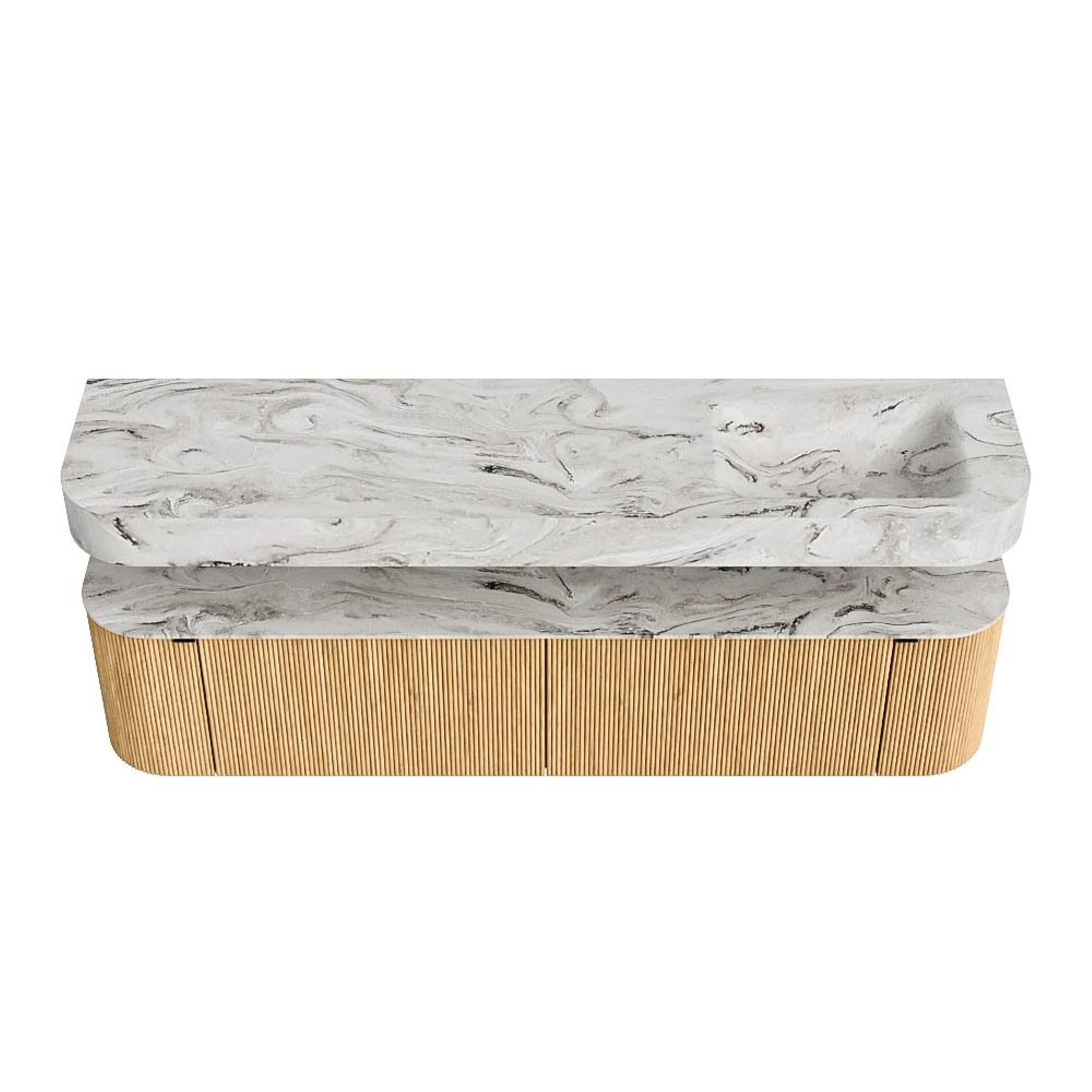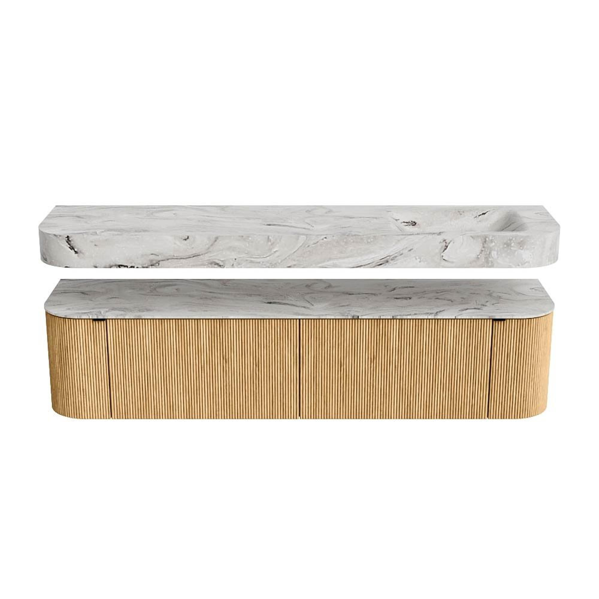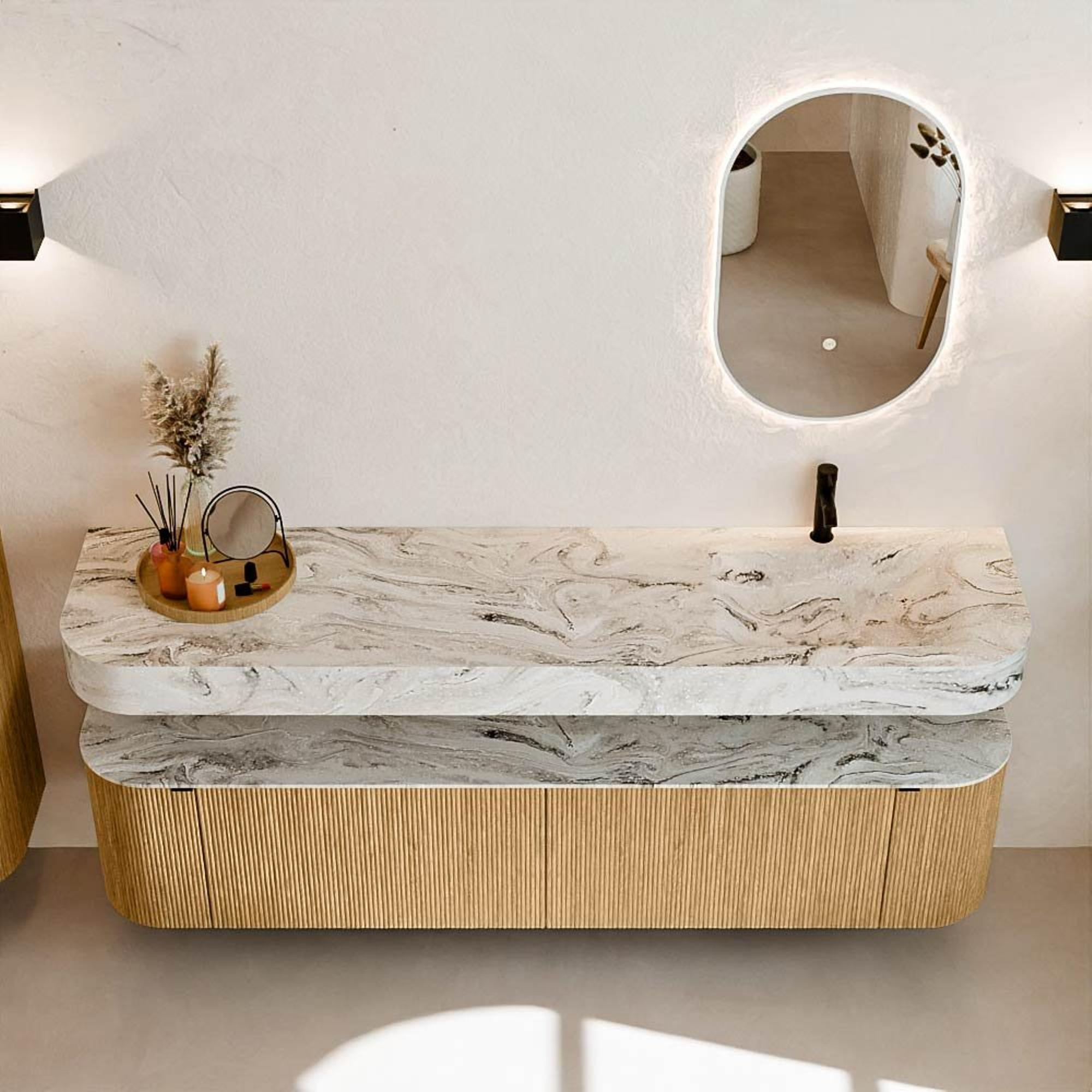 MONDIAZ THOR-DLUX 190cm badmeubel ronding links + rechts kleur Oak met 2 lades en 2 deuren. Vrijhangende wastafel CLOUD Rechts 1 kraangat kleur Glace.