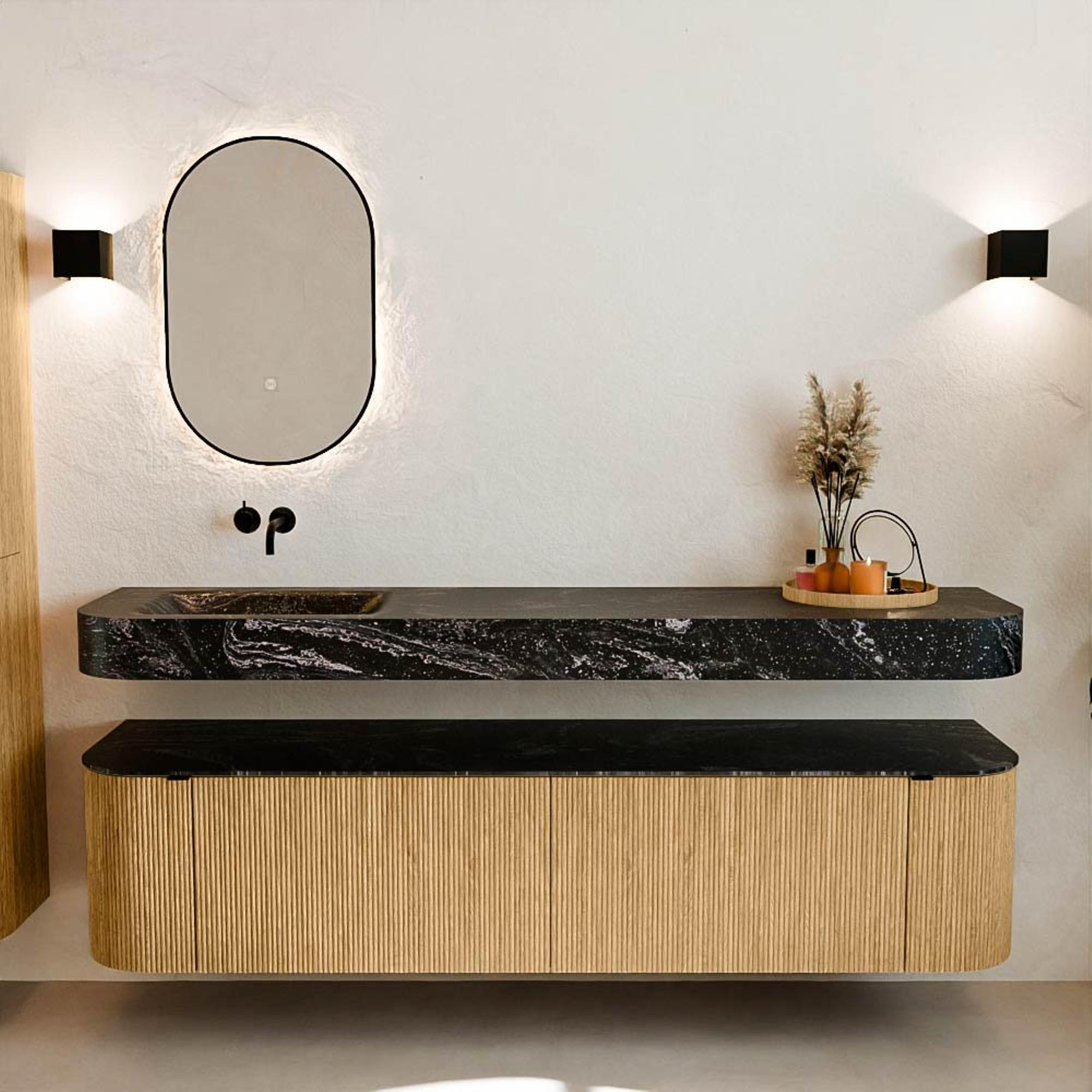 MONDIAZ THOR-DLUX 190cm badmeubel ronding links + rechts kleur Oak met 2 lades en 2 deuren. Vrijhangende wastafel CLOUD Links zonder kraangat kleur Lava.