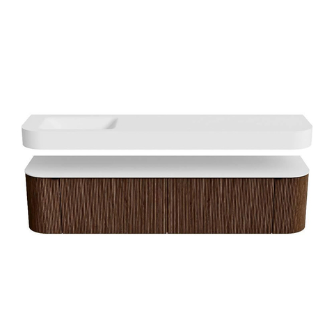 Boven het meubel zweeft een bijpassende, vrij hangende wastafel met afgeronde hoeken – perfect afgestemd op de vorm van de kast. De wastafel is uitgevoerd in Solid Surface en volgt subtiel de lijnen van het onderliggende meubel, waardoor een harmonieus geheel ontstaat. Het Solid Surface topblad vormt een sterke, onderhoudsvriendelijke basis en maakt de combinatie compleet.