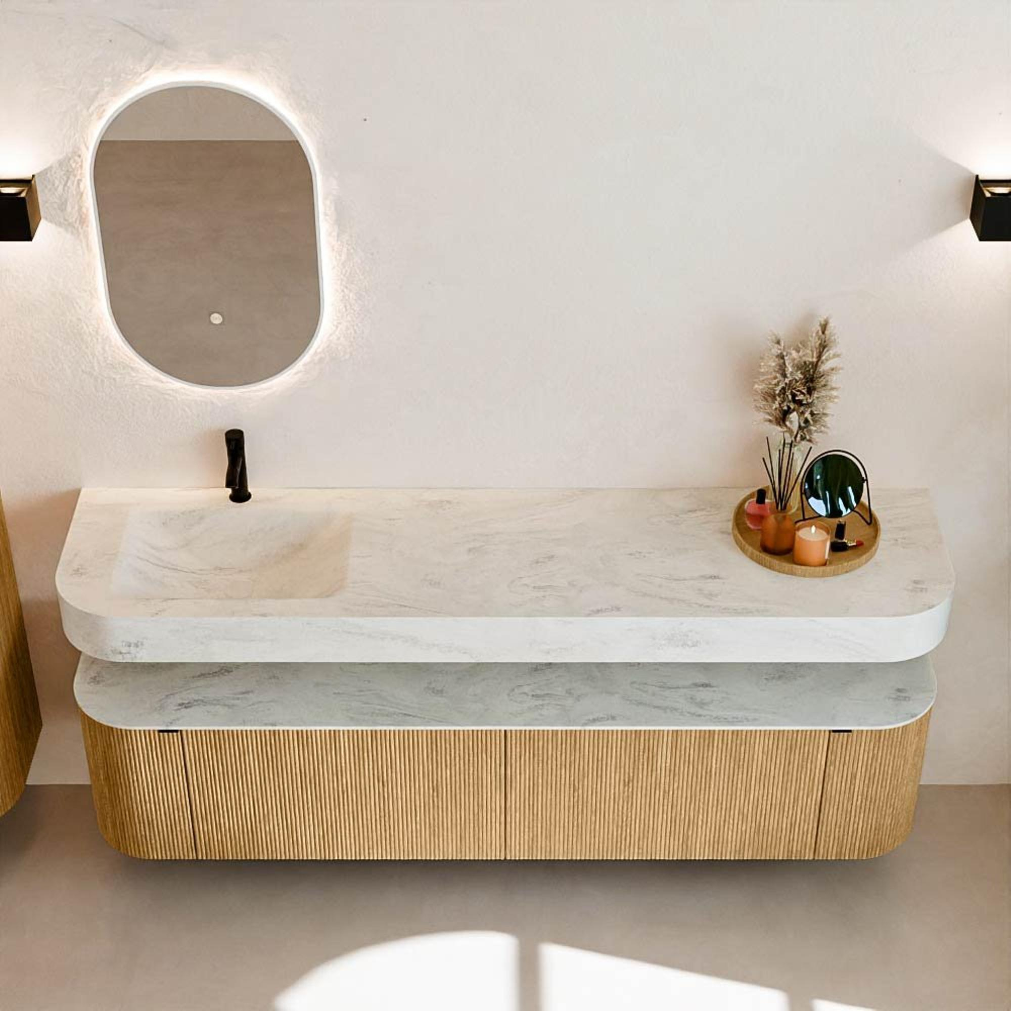 MONDIAZ THOR-DLUX 190cm badmeubel ronding links + rechts kleur Oak met 2 lades en 2 deuren. Vrijhangende wastafel CLOUD Links 1 kraangat kleur Opalo.