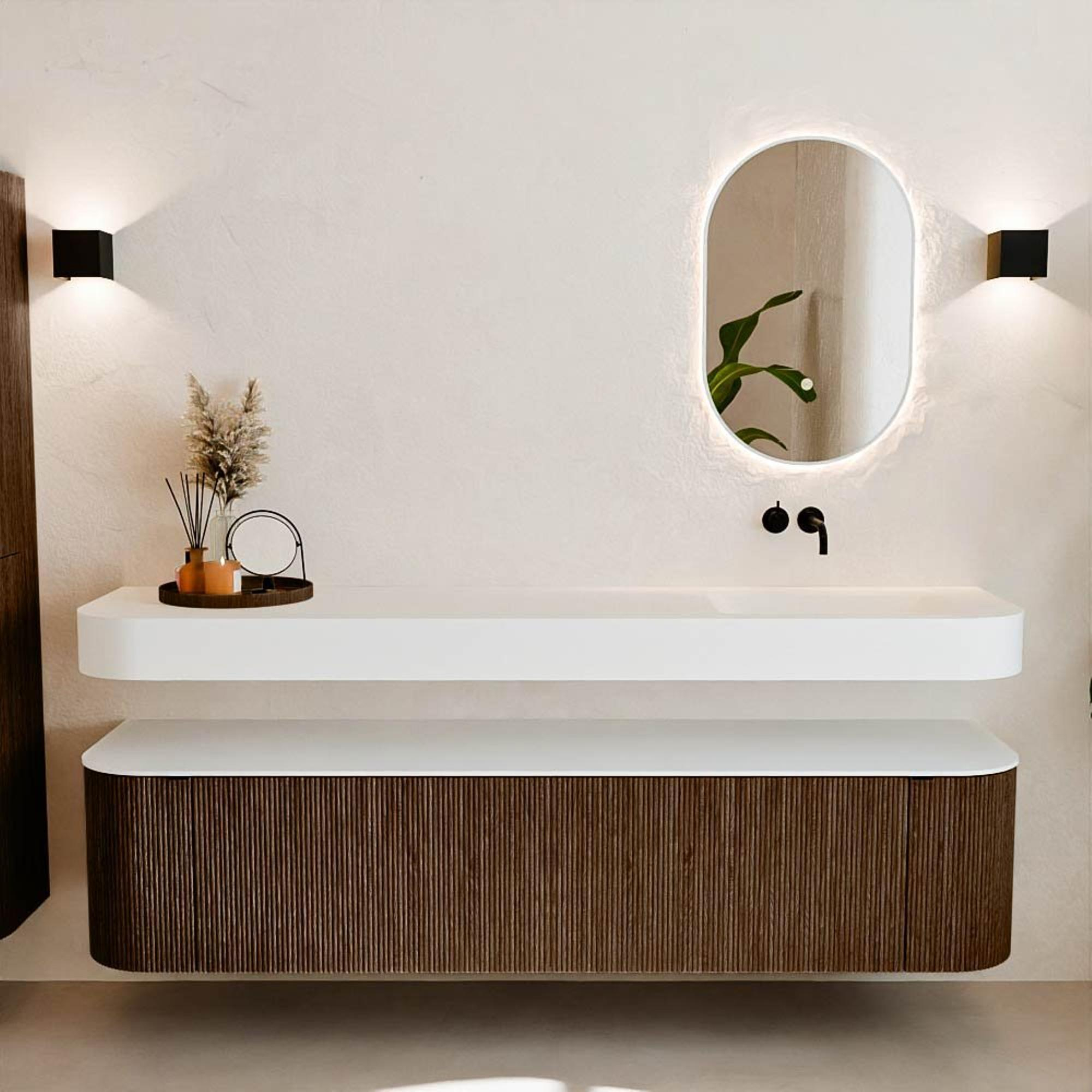 Natuurlijke materialen in warme tinten. De verticale ribbels brengen ritme en textuur in het ontwerp, terwijl het eikenhout zorgt voor een warme, ambachtelijke uitstraling. Kies uit 5 houttinten OAK, WALNUT, DUSK, SHADOW en RUBY zorgvuldig geselecteerde houtkleuren om zowel moderne als klassieke badkamers te verrijken.