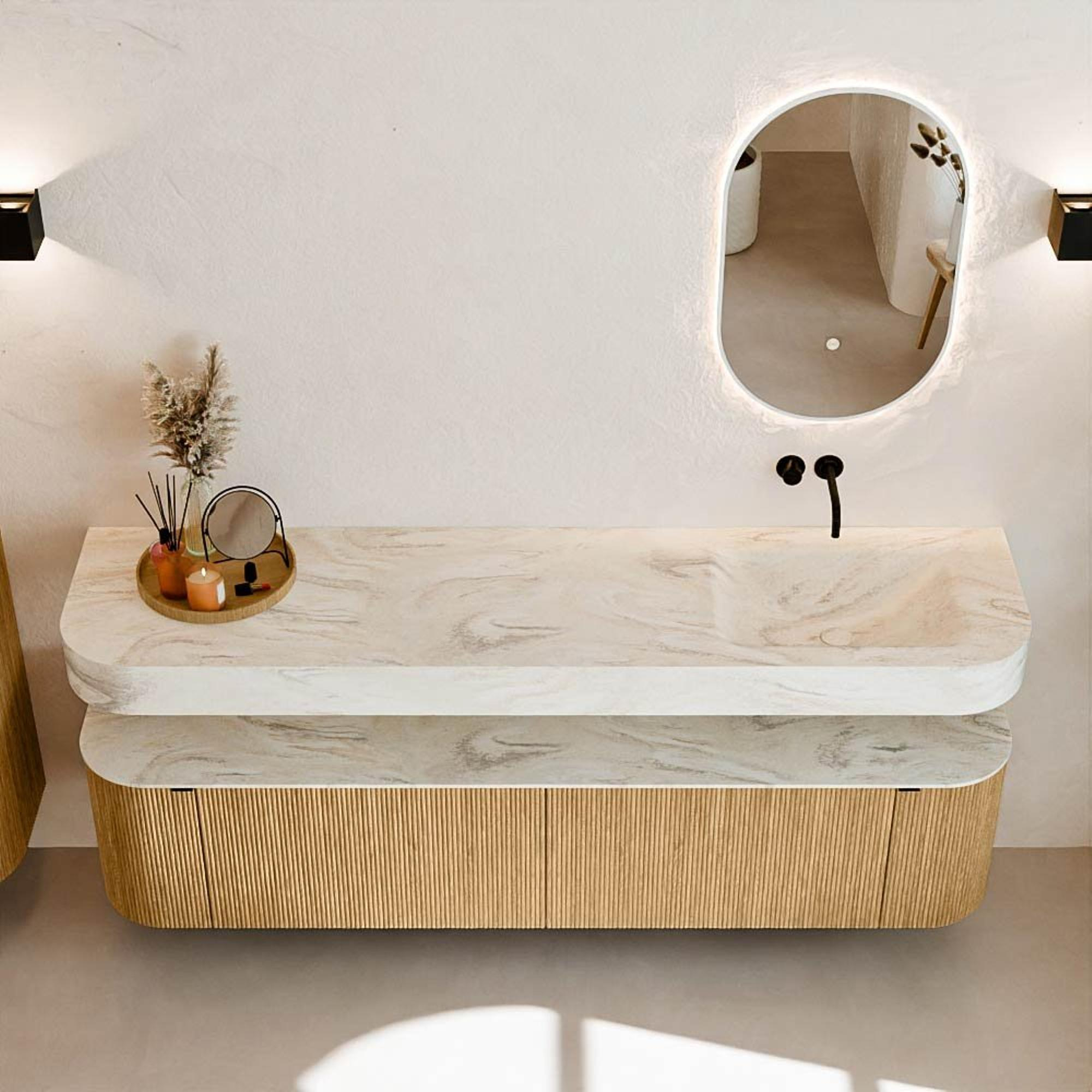 MONDIAZ THOR-DLUX 190cm badmeubel ronding links + rechts kleur Oak met 2 lades en 2 deuren. Vrijhangende wastafel CLOUD Rechts zonder kraangat kleur Ostra.