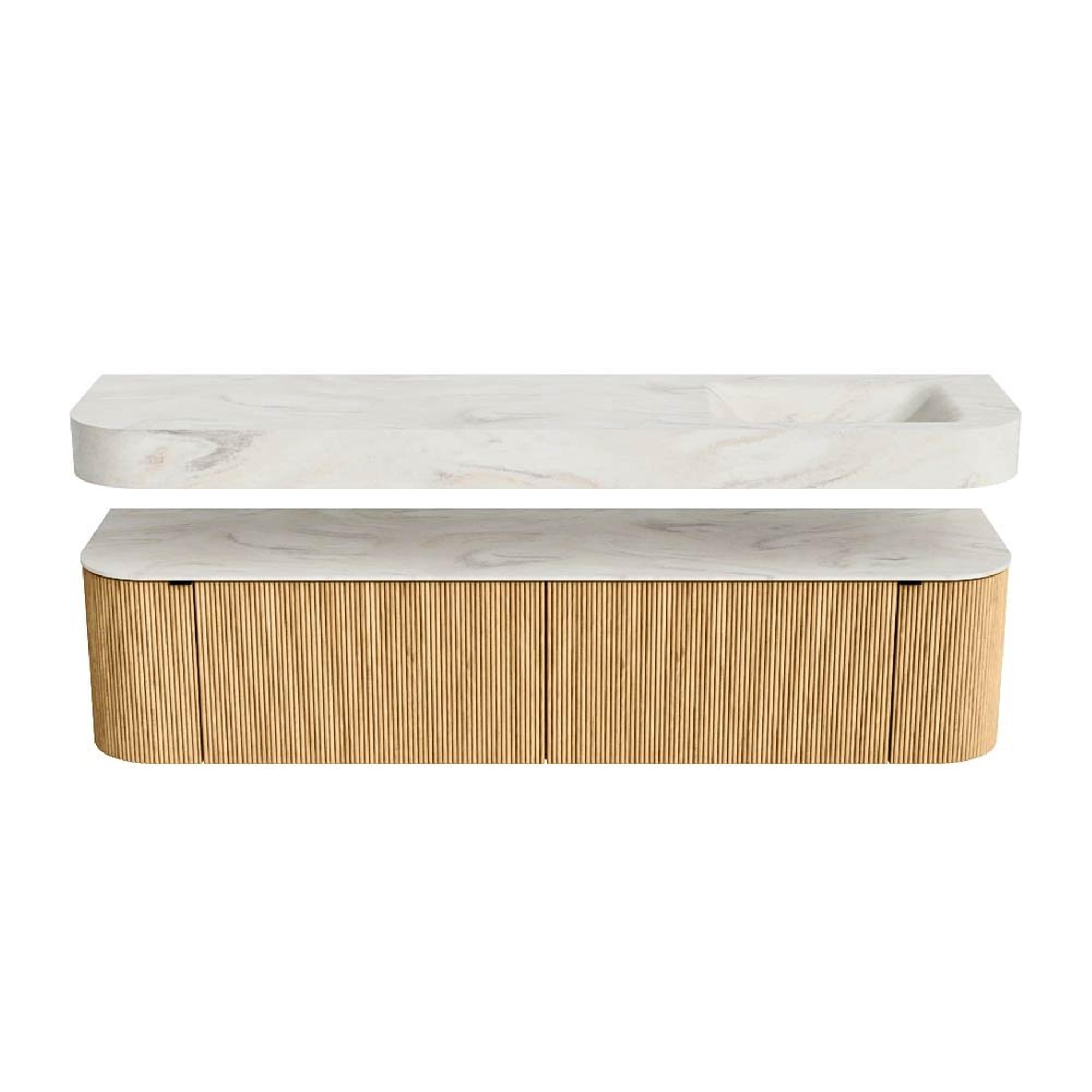MONDIAZ THOR-DLUX 190cm badmeubel ronding links + rechts kleur Oak met 2 lades en 2 deuren. Vrijhangende wastafel CLOUD Rechts 1 kraangat kleur Ostra.