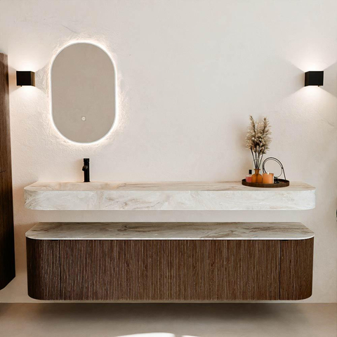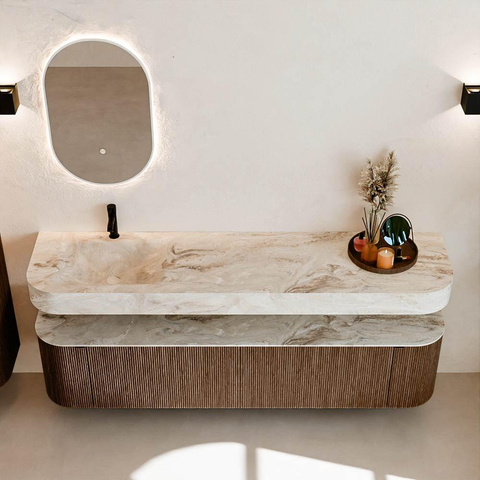 MONDIAZ THOR-DLUX 190cm badmeubel ronding links + rechts kleur Walnut met 2 lades en 2 deuren. Vrijhangende wastafel CLOUD Links 1 kraangat kleur Frappe.