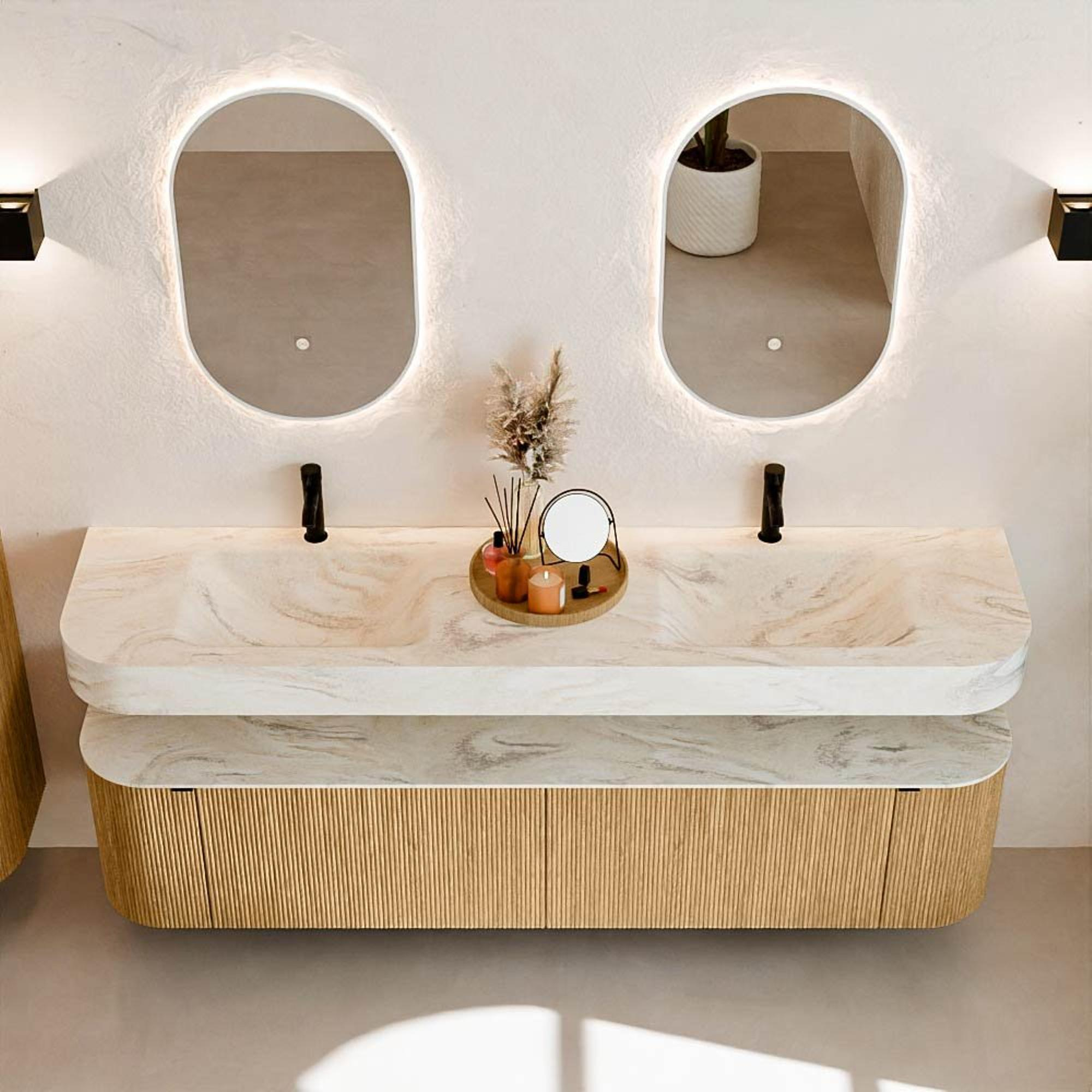 Natuurlijke materialen in warme tinten. De verticale ribbels brengen ritme en textuur in het ontwerp, terwijl het eikenhout zorgt voor een warme, ambachtelijke uitstraling. Kies uit 5 houttinten OAK, WALNUT, DUSK, SHADOW en RUBY zorgvuldig geselecteerde houtkleuren om zowel moderne als klassieke badkamers te verrijken.