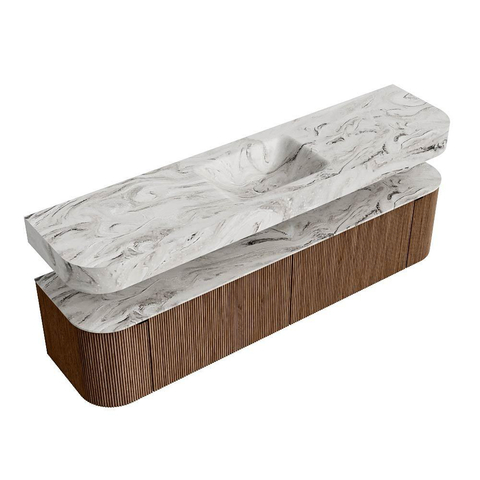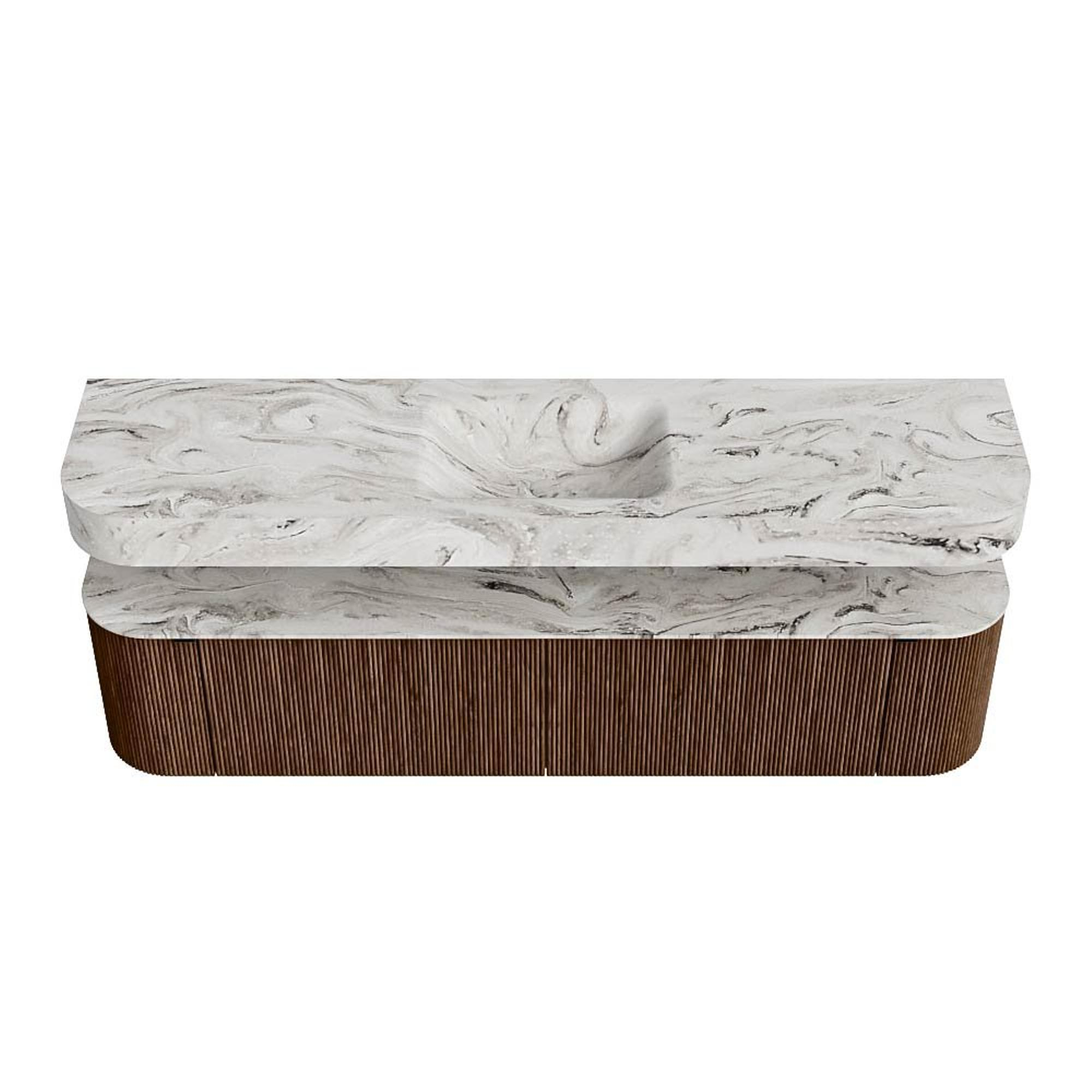 MONDIAZ THOR-DLUX 190cm badmeubel ronding links + rechts kleur Walnut met 2 lades en 2 deuren. Vrijhangende wastafel CLOUD Midden zonder kraangat kleur Glace.