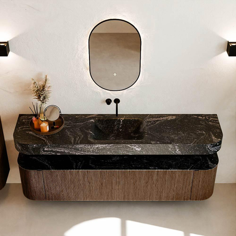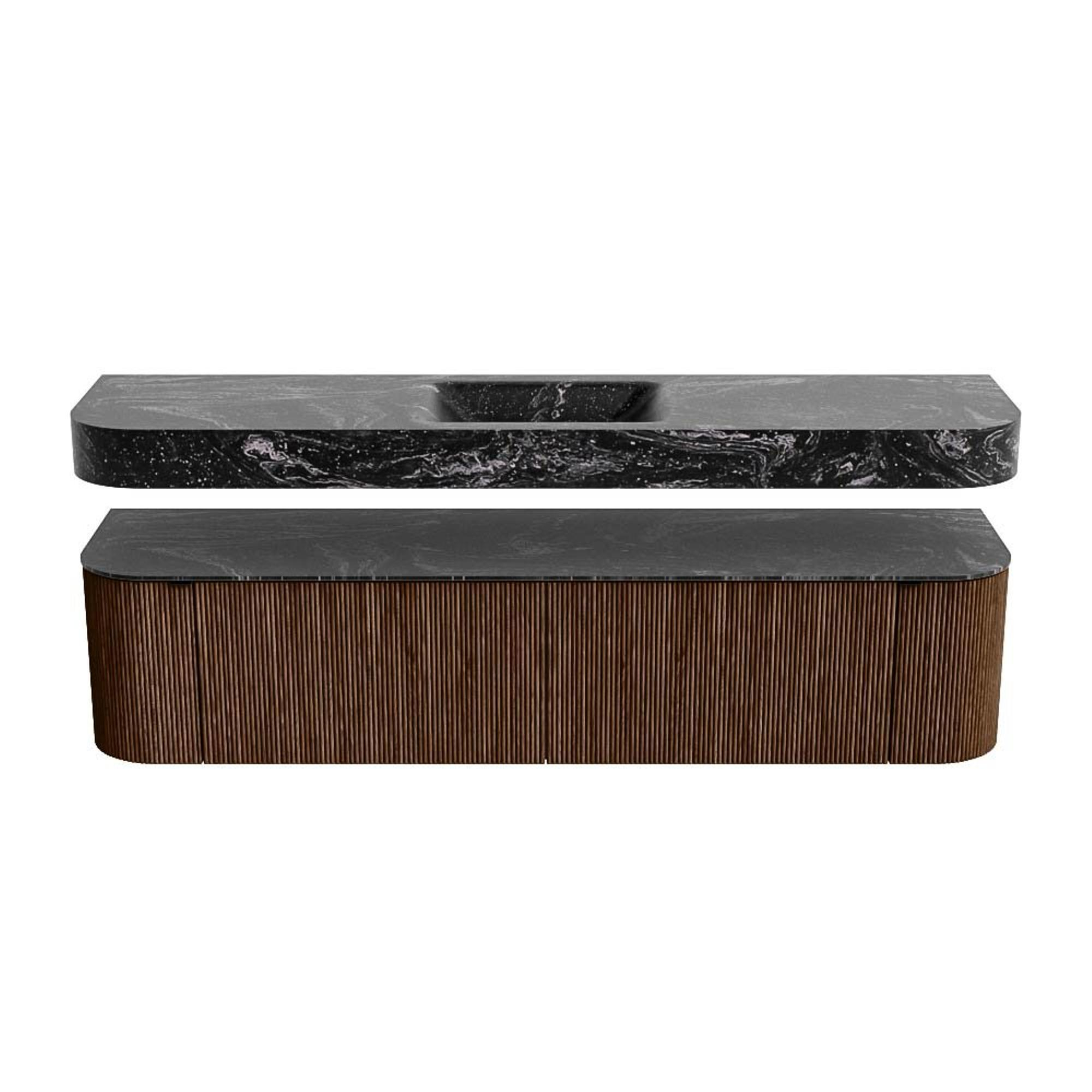 MONDIAZ THOR-DLUX 190cm badmeubel ronding links + rechts kleur Walnut met 2 lades en 2 deuren. Vrijhangende wastafel CLOUD Midden zonder kraangat kleur Lava.