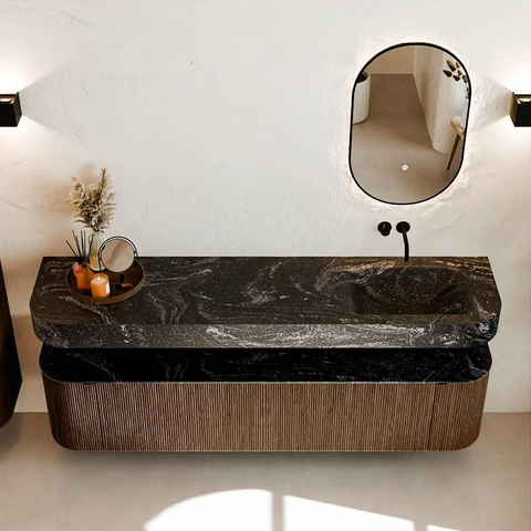 MONDIAZ THOR-DLUX 190cm badmeubel ronding links + rechts kleur Walnut met 2 lades en 2 deuren. Vrijhangende wastafel CLOUD Rechts zonder kraangat kleur Lava.