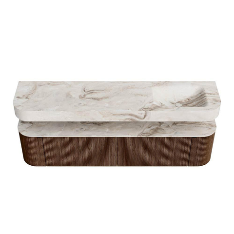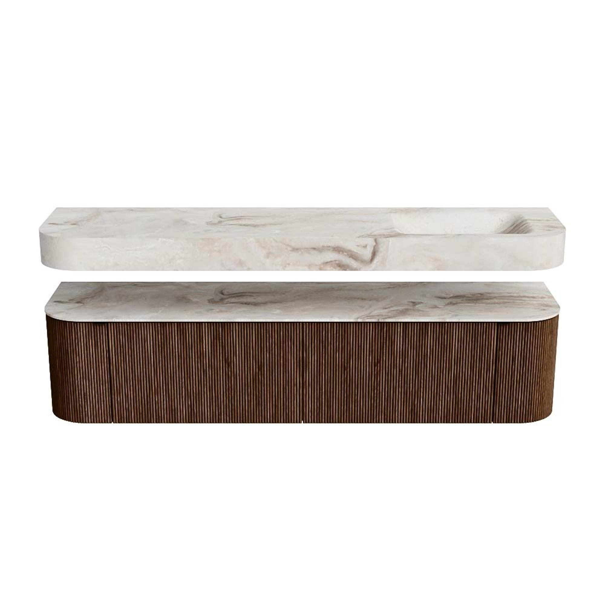 MONDIAZ THOR-DLUX 190cm badmeubel ronding links + rechts kleur Walnut met 2 lades en 2 deuren. Vrijhangende wastafel CLOUD Rechts 1 kraangat kleur Frappe.