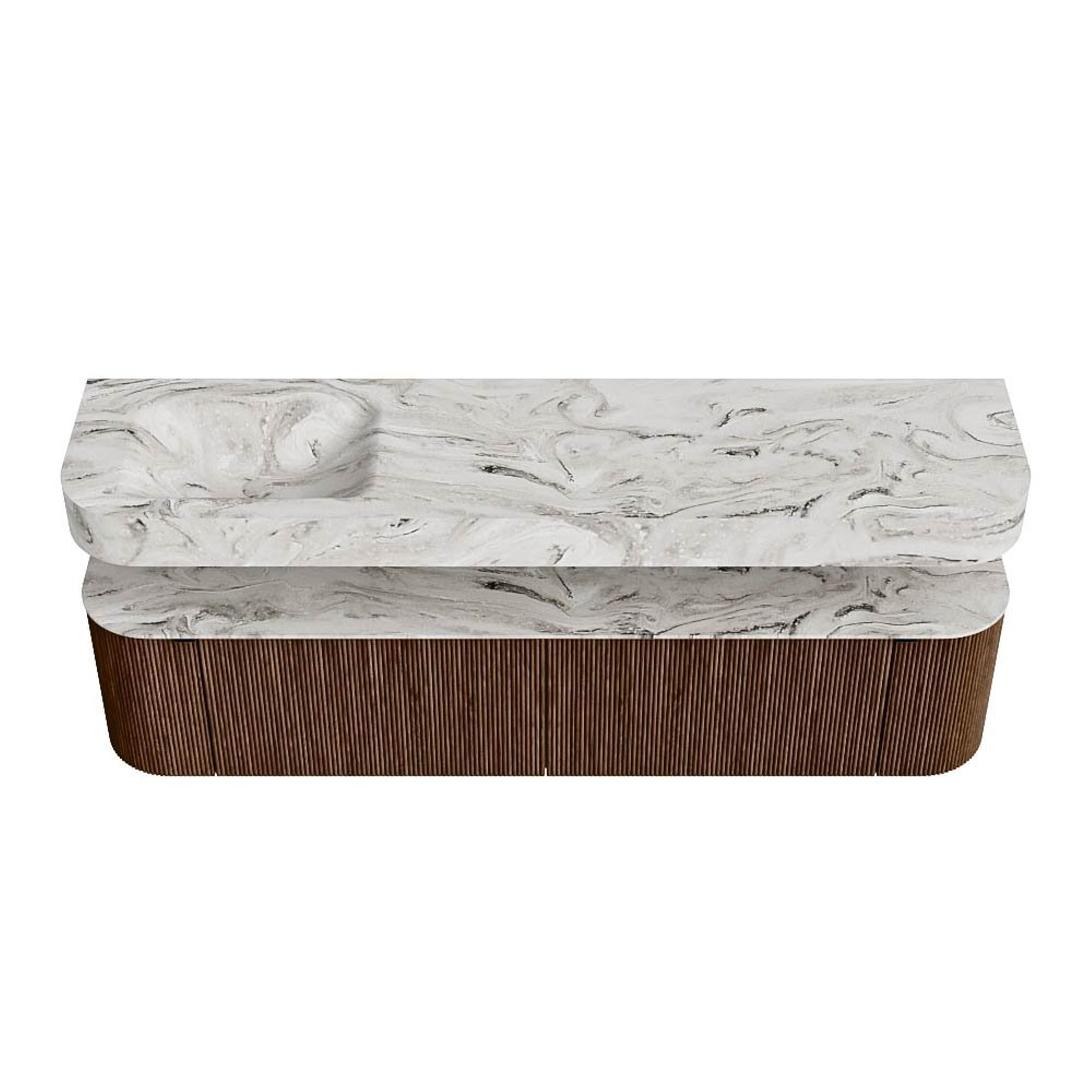 MONDIAZ THOR-DLUX 190cm badmeubel ronding links + rechts kleur Walnut met 2 lades en 2 deuren. Vrijhangende wastafel CLOUD Links 1 kraangat kleur Glace.