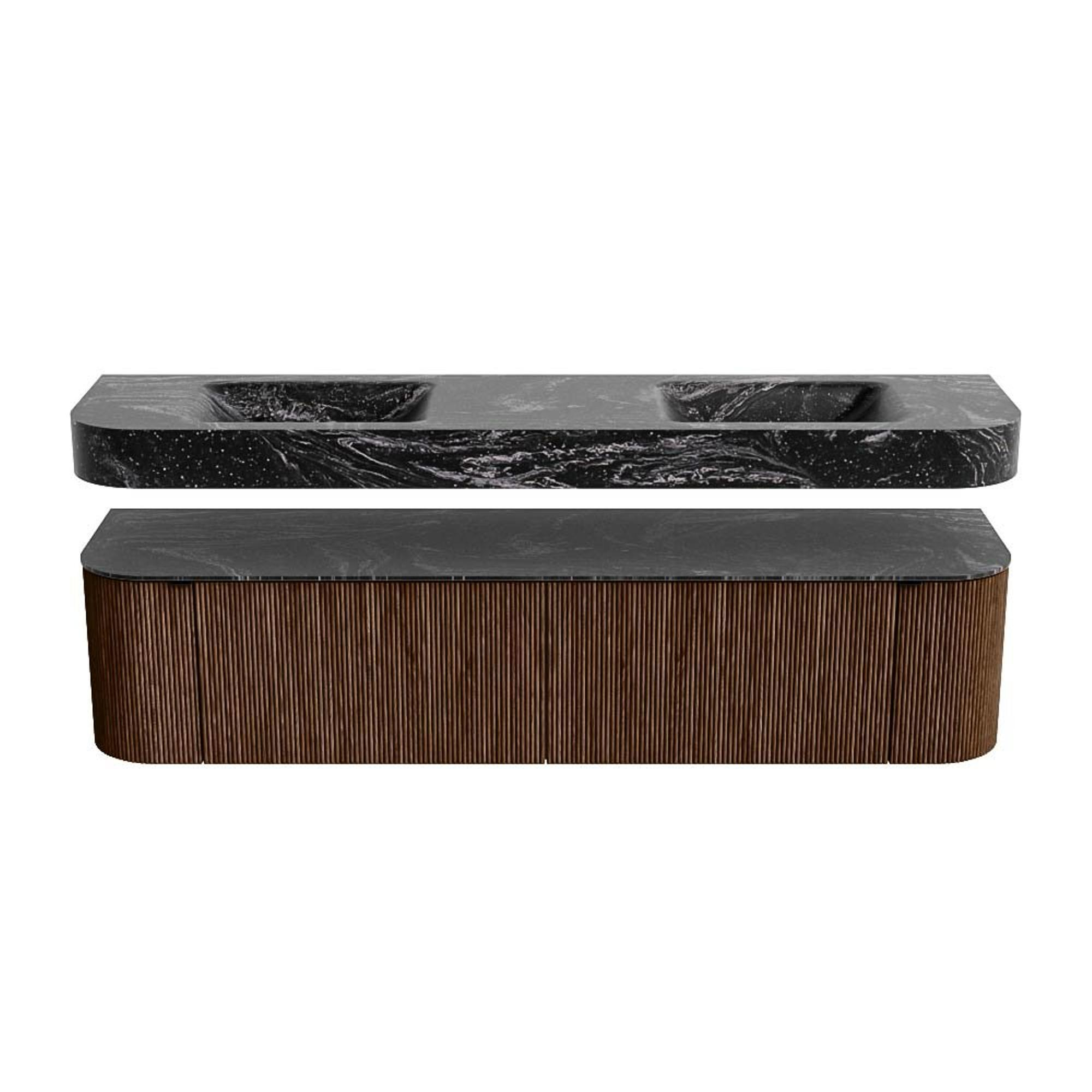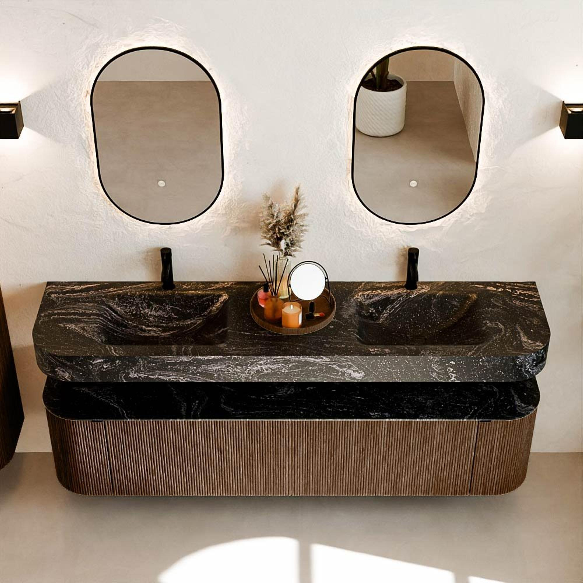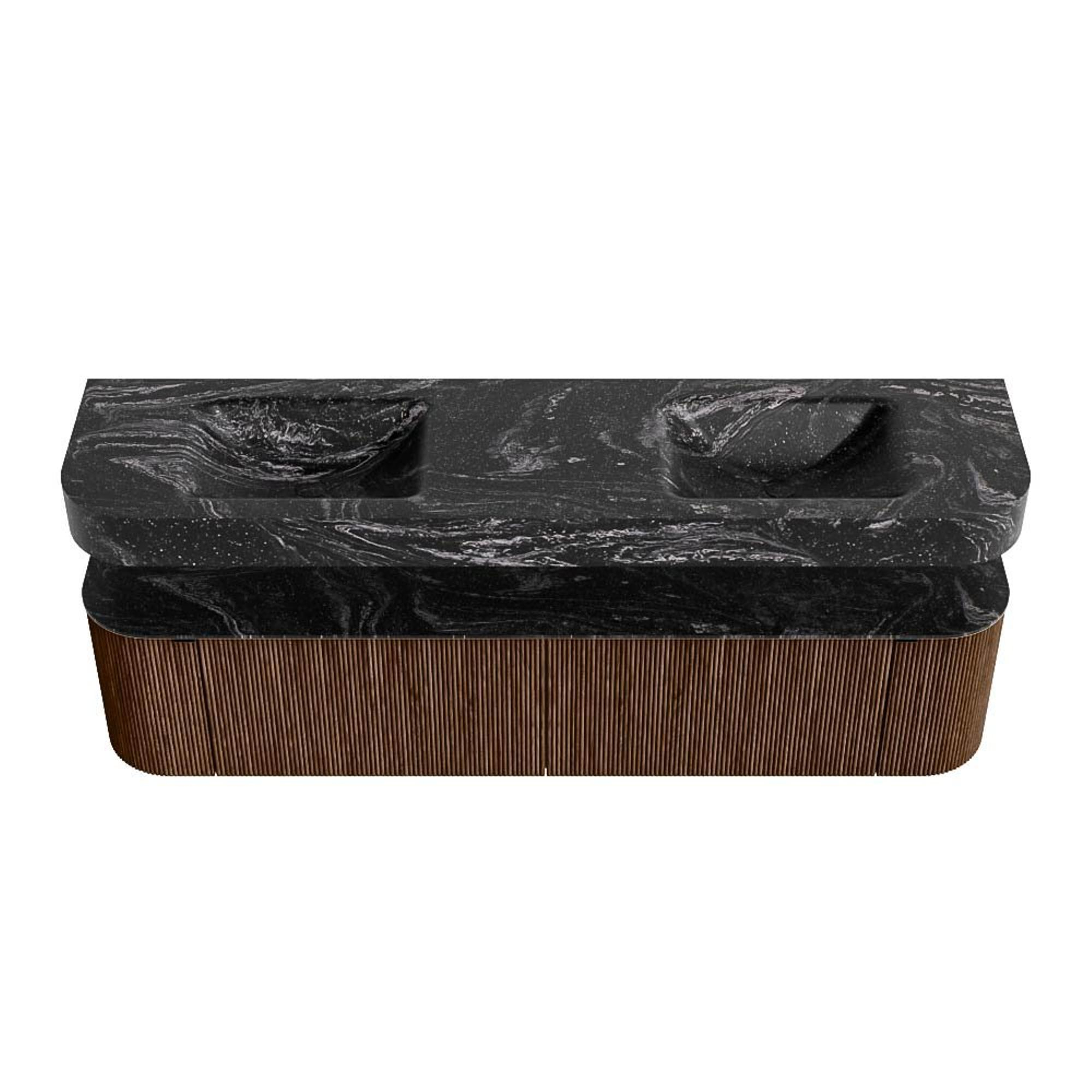 MONDIAZ THOR-DLUX 190cm badmeubel ronding links + rechts kleur Walnut met 2 lades en 2 deuren. Vrijhangende wastafel CLOUD Dubbel 2 kraangaten kleur Lava.