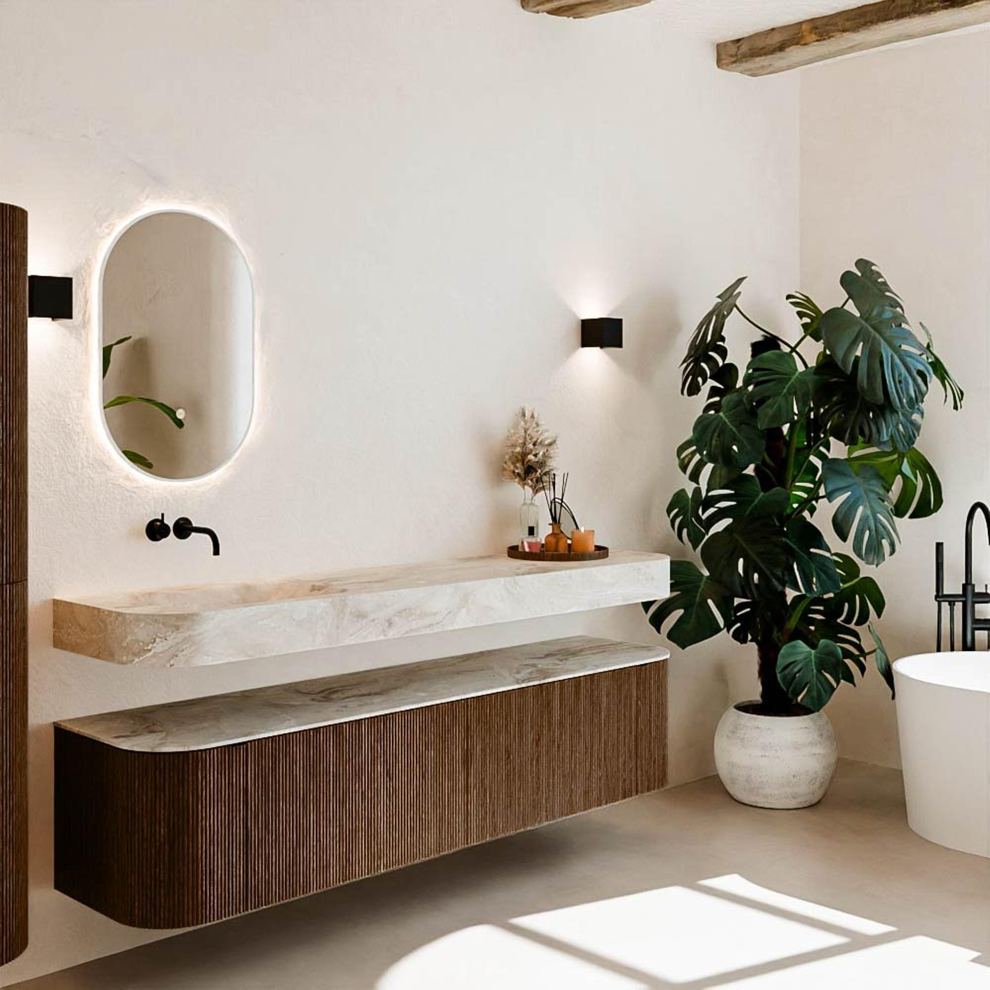 Natuurlijke materialen in warme tinten. De verticale ribbels brengen ritme en textuur in het ontwerp, terwijl het eikenhout zorgt voor een warme, ambachtelijke uitstraling. Kies uit 5 houttinten OAK, WALNUT, DUSK, SHADOW en RUBY zorgvuldig geselecteerde houtkleuren om zowel moderne als klassieke badkamers te verrijken.