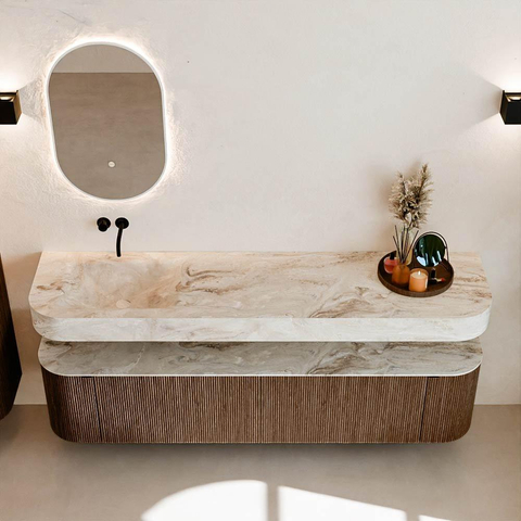 MONDIAZ THOR-DLUX 190cm badmeubel ronding links + rechts kleur Walnut met 2 lades en 2 deuren. Vrijhangende wastafel CLOUD Links zonder kraangat kleur Frappe.