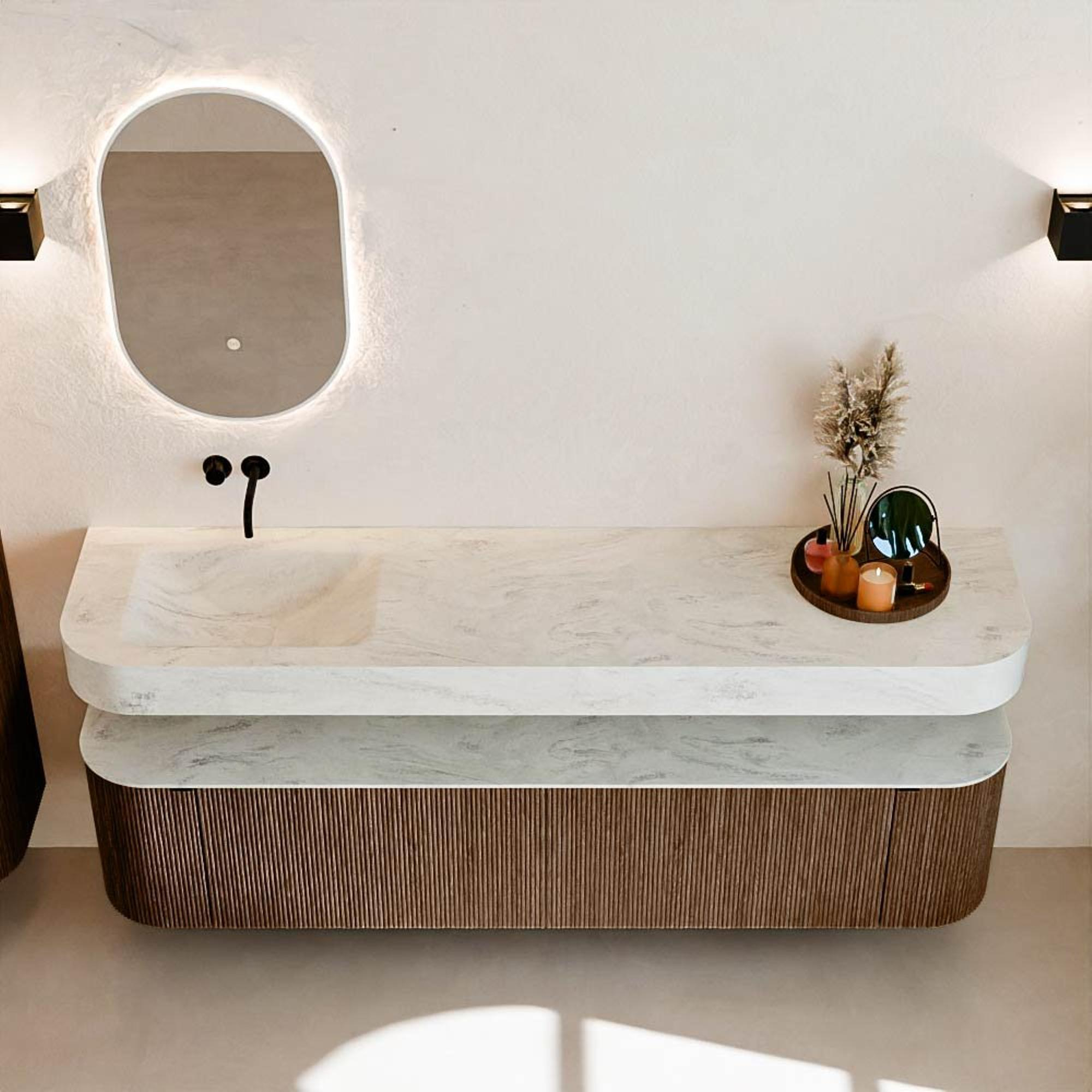 MONDIAZ THOR-DLUX 190cm badmeubel ronding links + rechts kleur Walnut met 2 lades en 2 deuren. Vrijhangende wastafel CLOUD Links zonder kraangat kleur Opalo.