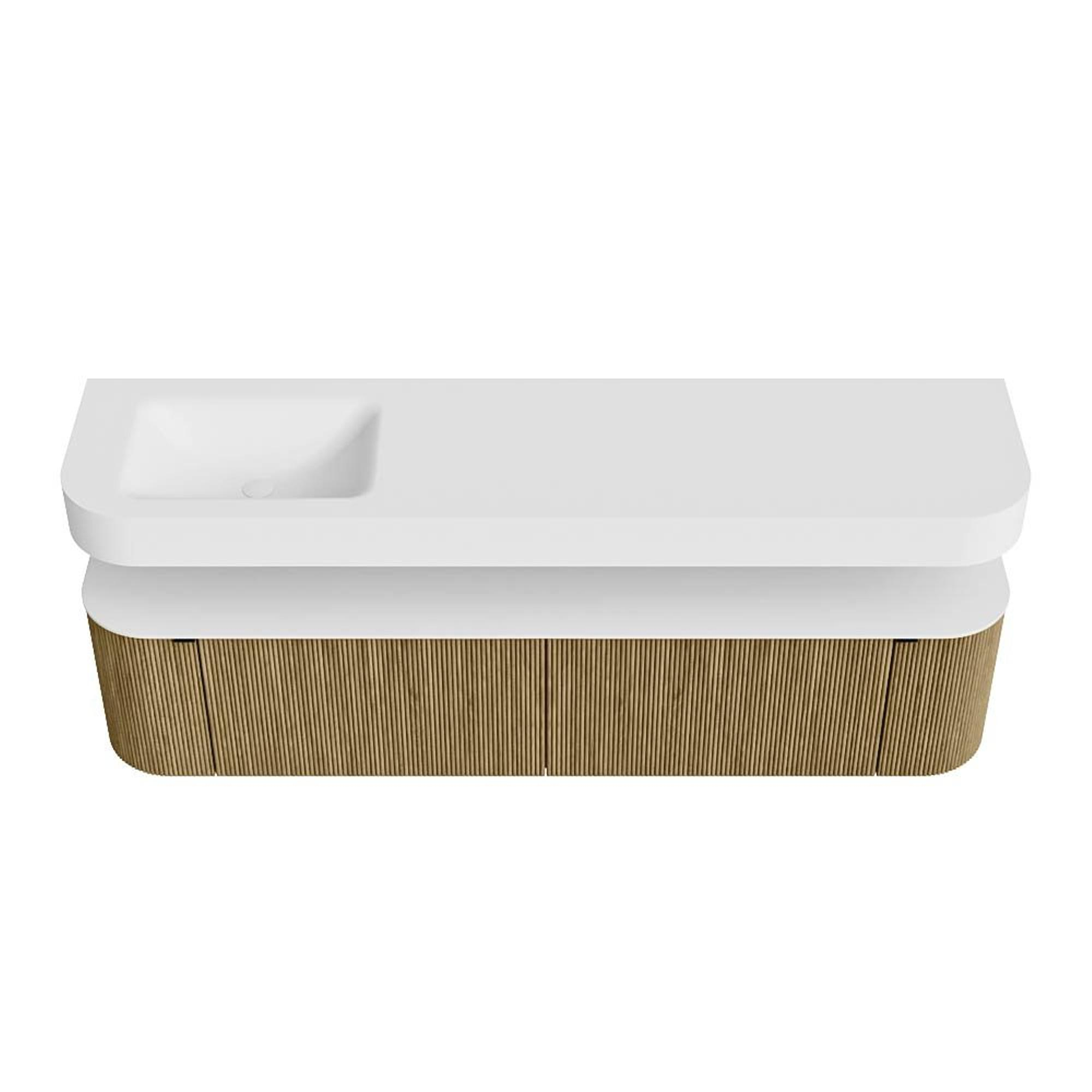 Boven het meubel zweeft een bijpassende, vrij hangende wastafel met afgeronde hoeken – perfect afgestemd op de vorm van de kast. De wastafel is uitgevoerd in Solid Surface en volgt subtiel de lijnen van het onderliggende meubel, waardoor een harmonieus geheel ontstaat. Het Solid Surface topblad vormt een sterke, onderhoudsvriendelijke basis en maakt de combinatie compleet.